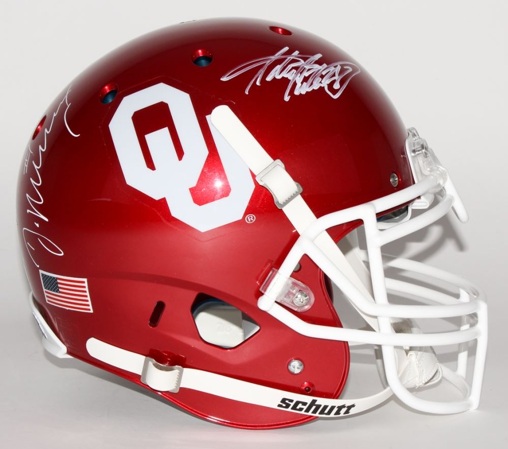 Schutt full-size authentic pro-line helmet. Hand-signed in white paint pen by DeMarco Murray (Cowboys, Titans) and Adrian Peterson (Vikings). Please note, the autograph is imperfect, see photos for more details.