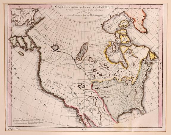 DeVaugondy Map of America. A 1772 De Vaugondy map of the North and West of America measuring 11¾ x 14¾"; matted to 24¾ x 31½". Very good.