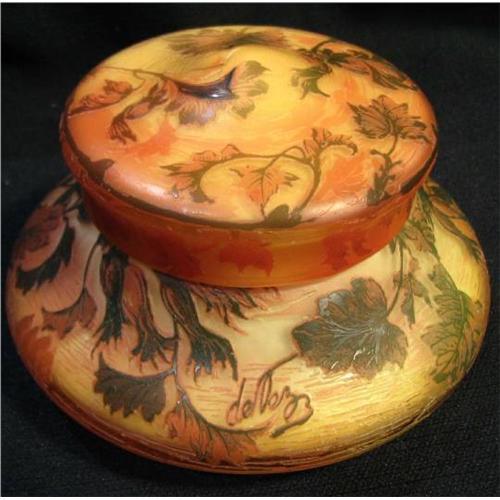 Colorful DeVez covered box in yellow and salmon. The cameo bowl has a foliaged vine with trumpet flowers encompassing a rippled body of water, scattered with foliaged trees. The cover repeats the vine pattern over a mass of clouds. Height 3 1/8" and the diameter is 4 3/4". Insignificant rim nicks inside the cover. Great piece. Excelent condition, 1890-1910.