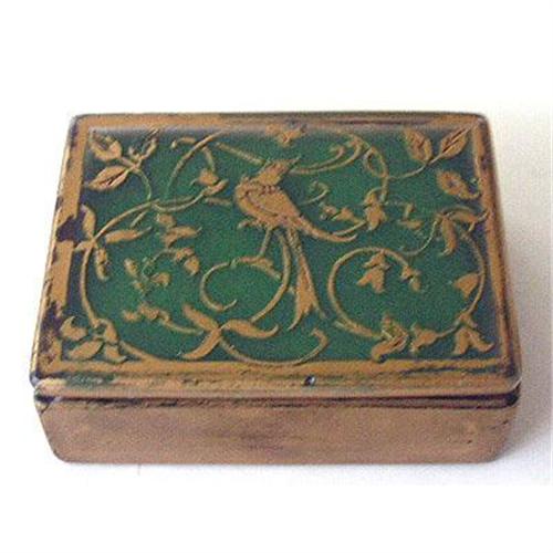 <tr><td>Title:DeVibiss Green and Gold Satin Glass Jewelry Box</td></tr>