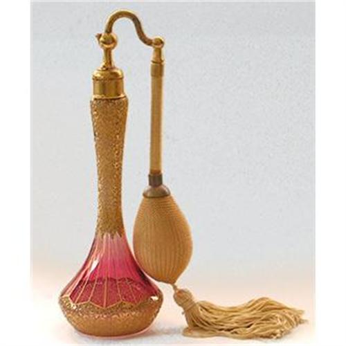 </font></strong>This magnificent Art Nouveau perfume atomizer bottle [aka Perfumizer] was produced for Devilbiss circa 1920, from cranberry glass with top and bottom panels of gold overlay with a sort of pebble finish [aka Rotten Acid Finish] and gold rays connecting the top and bottom portions. Measures 7 5/8 inches tall. The Devilbiss signature remains underneath the bottle. With only minor wear to some of the gold lines towards the bottom. The full length glass dauber is intact. The hardware is all original and is free from damage. The cranberry glass is in excellent condition - without any damage. I do not know if the cord, bulb and tassel have ever been replaced - they are in excellent condition and look old to my eye</font>