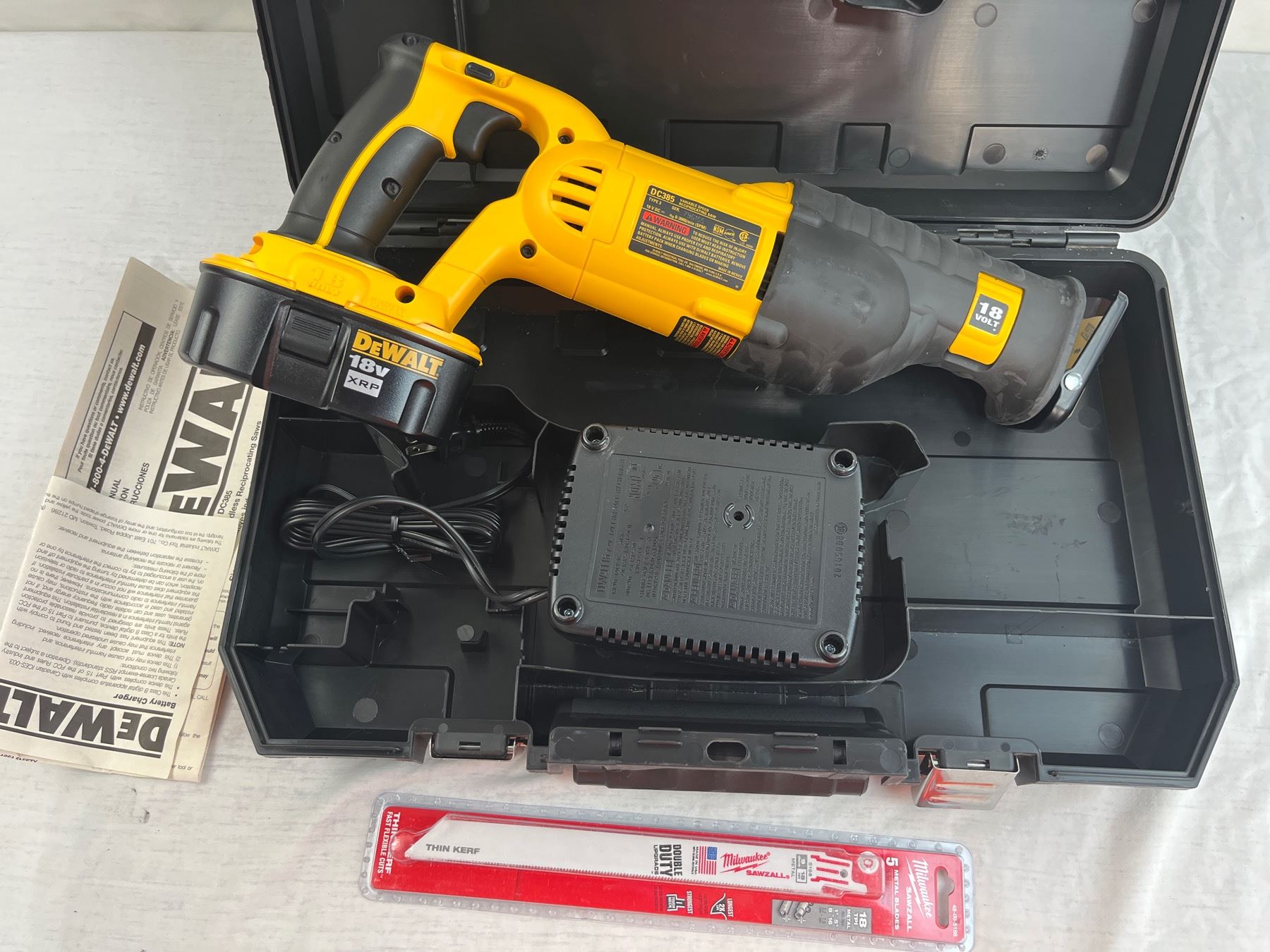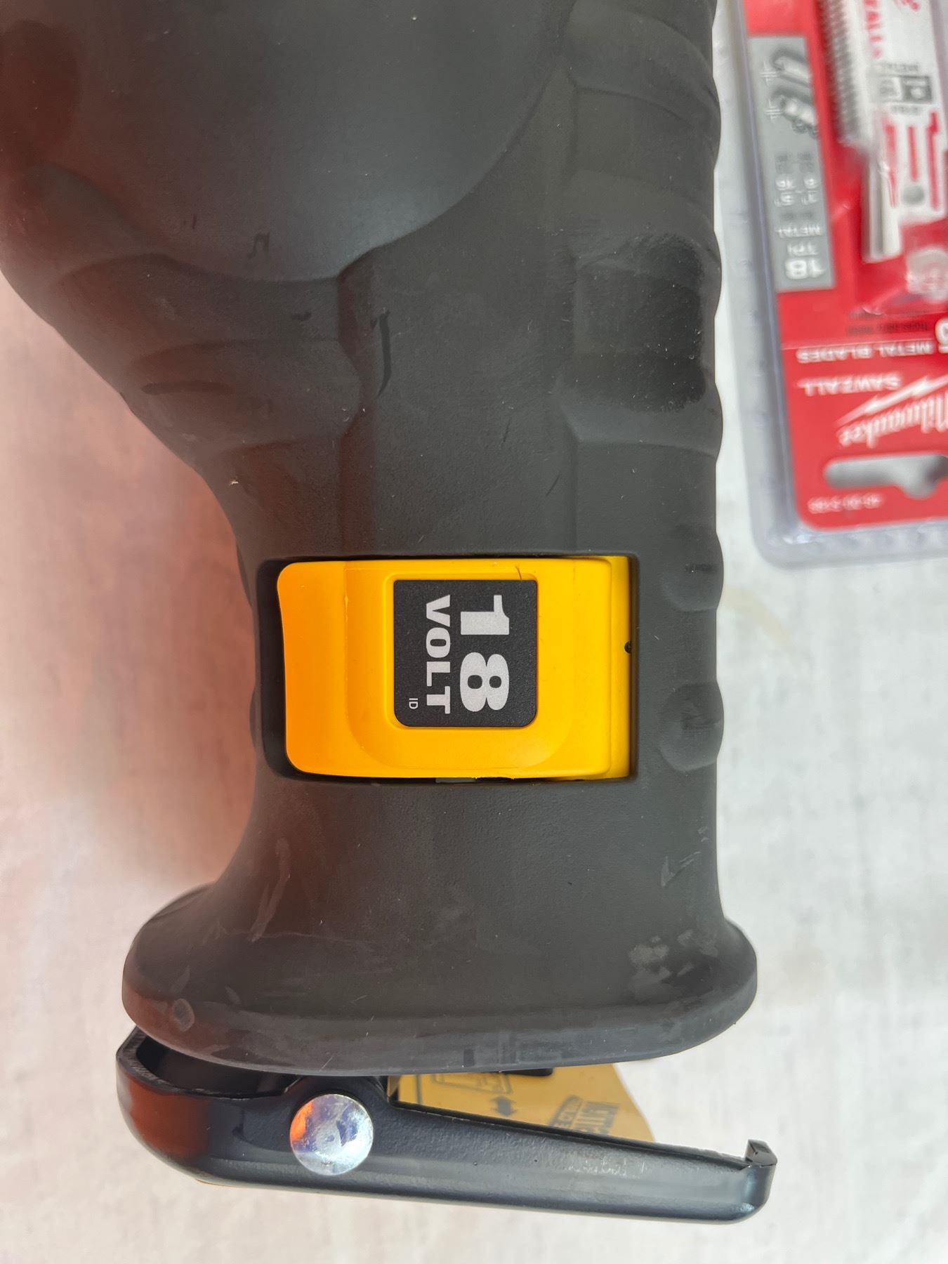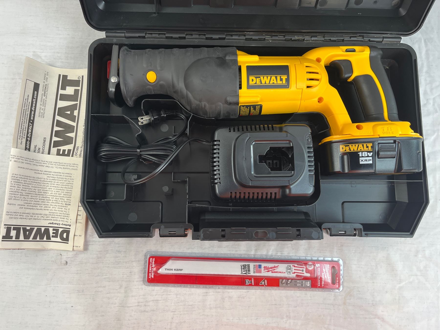 DC 385, 18 Volt - Works - in new condition - Includes battery, charger and new 5 pack of Milwakee metal blades