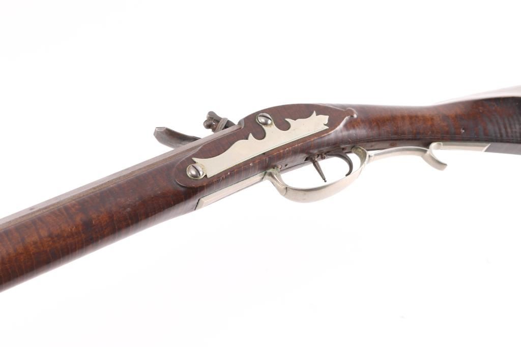 Fancy handmade contemporary Kentucky style flintlock rifle. 43 3/4" octagonal barrel, German silver front sight blade, dovetailed rear peep sight, stripped maple one-piece stock with cheek rest, stripped wooden ramrod with brass tip. Lock signed "DeWalt", Kentucky style double set triggers, fittings and escutcheons are silver toned, scroll work with engraved floral design patchbox. Overall length is 60", Lop is 13 3/4" Hammer does not stay cocked, needs new spring, wood is sound/very good, barrel is a dull gray with scatter patches of brown patina and the bore is very good, strong rifling, dusty.NRA Condition-Fair/Hammer. Antique Firearm.