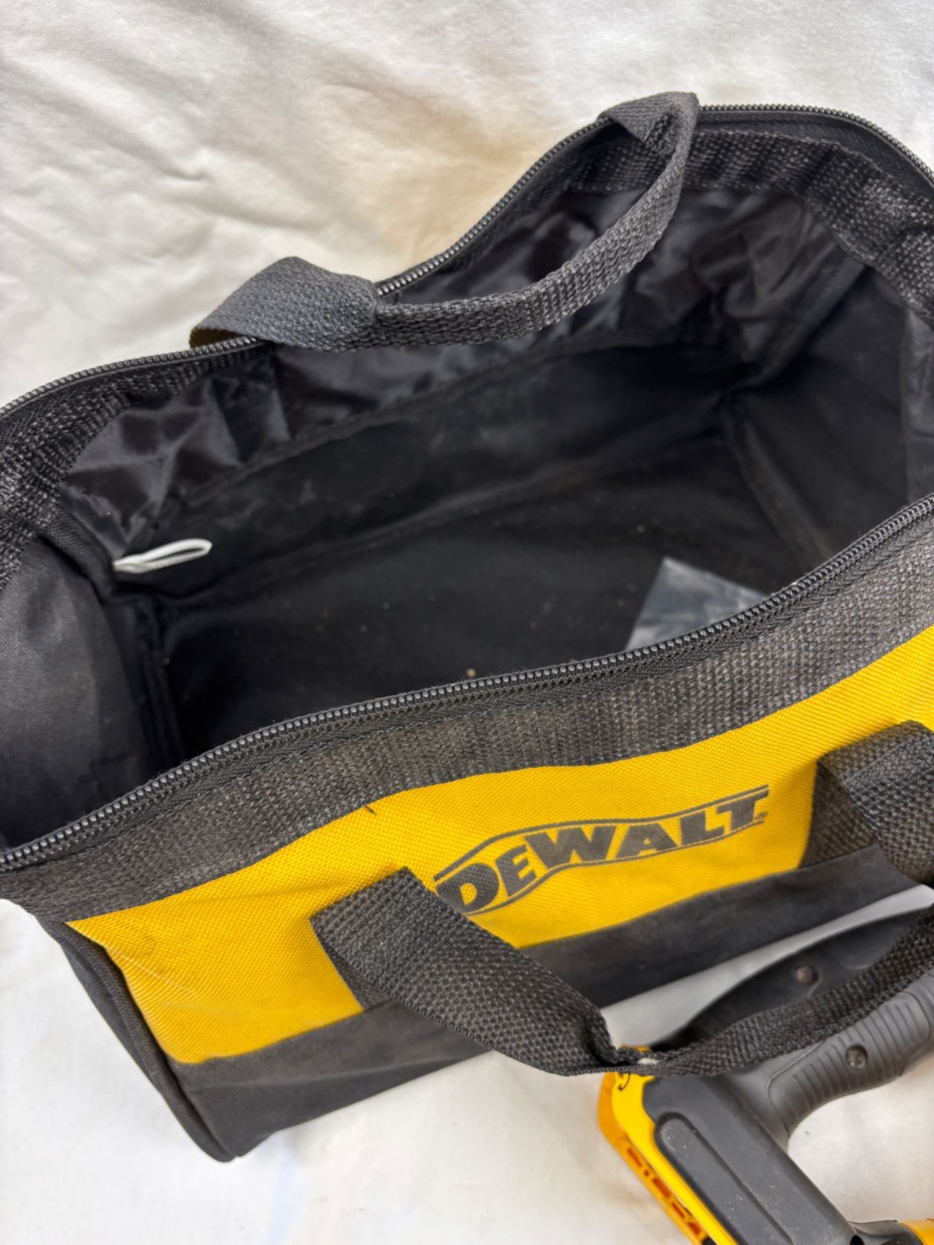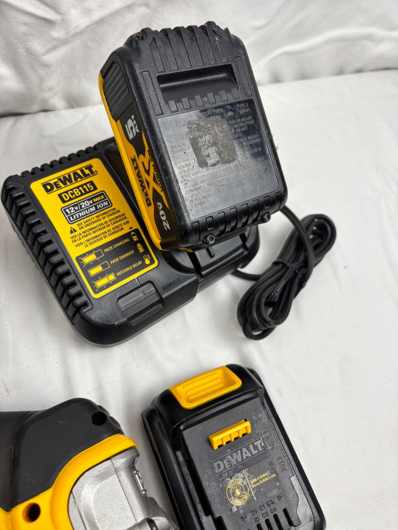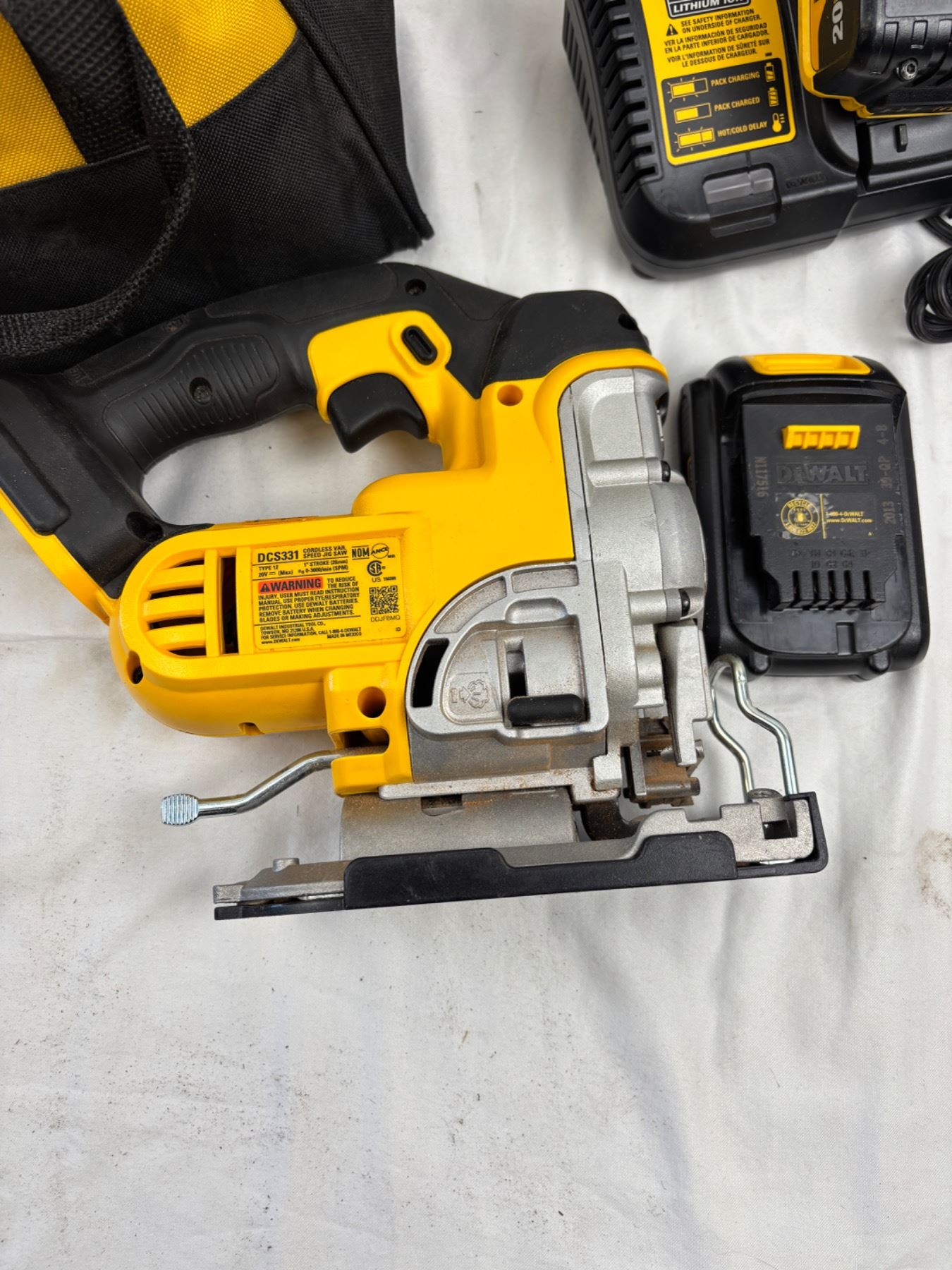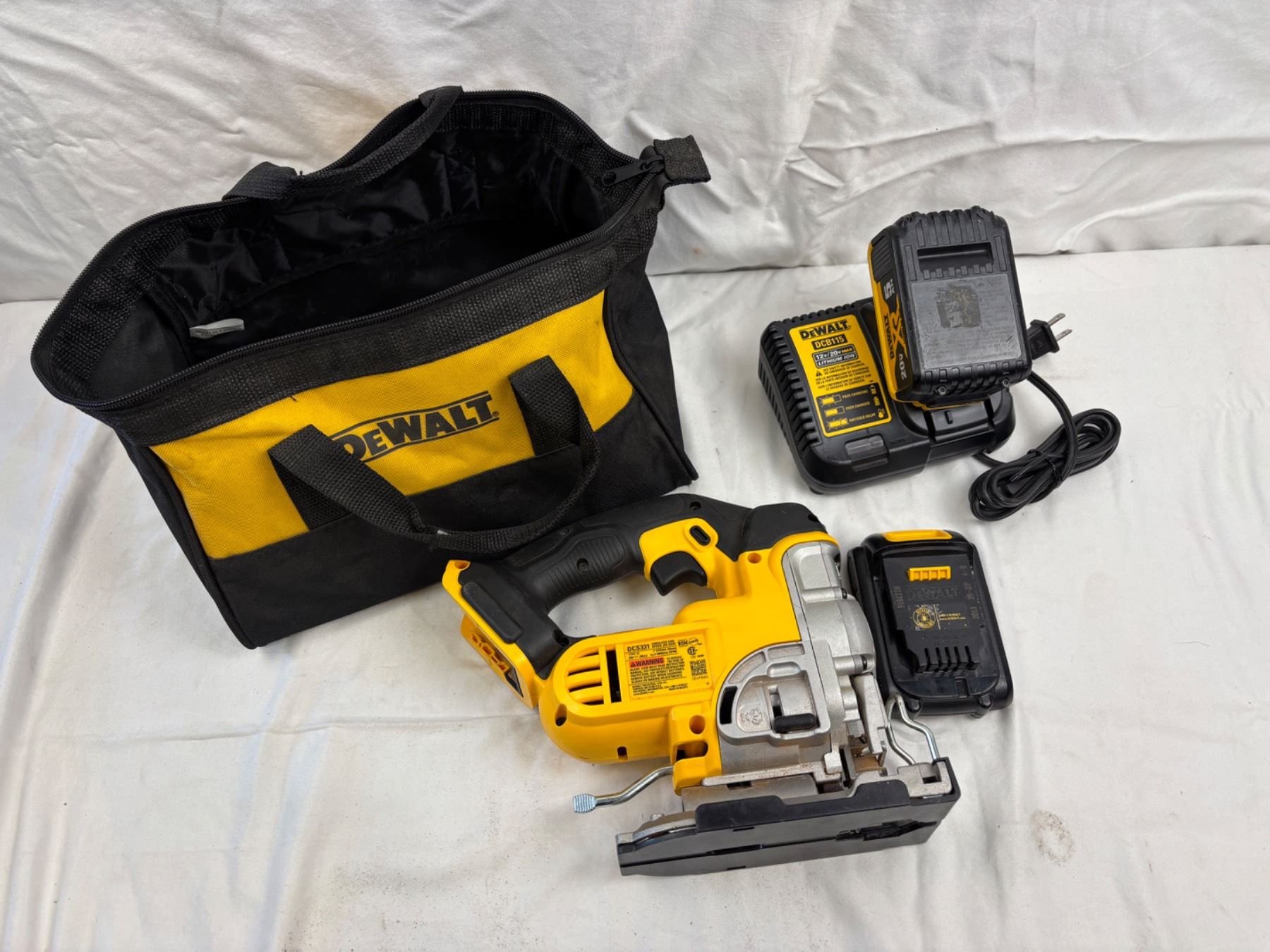 Includes a Dewalt tool bag, two batteries and one charger, DCS331 saw (turns on)