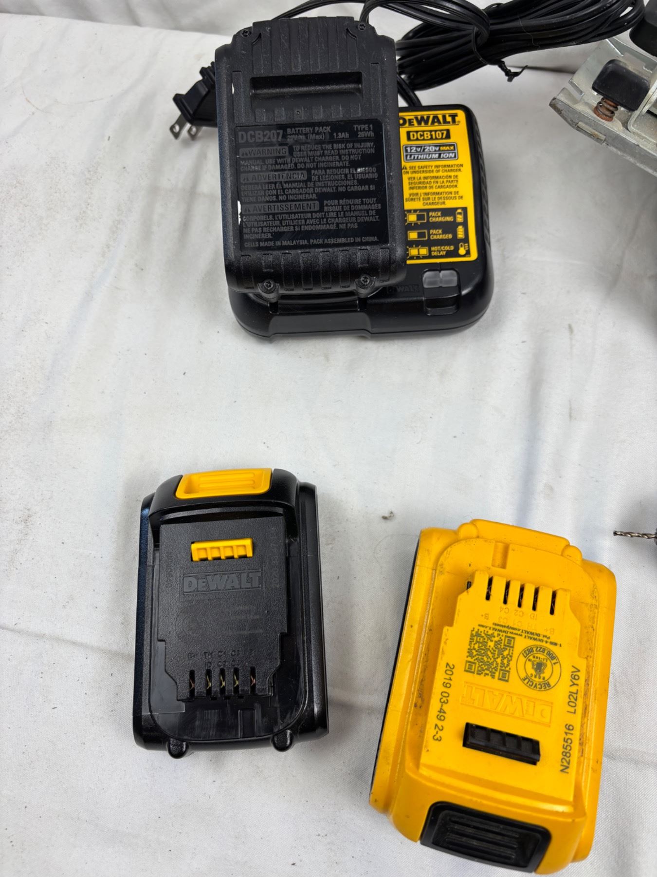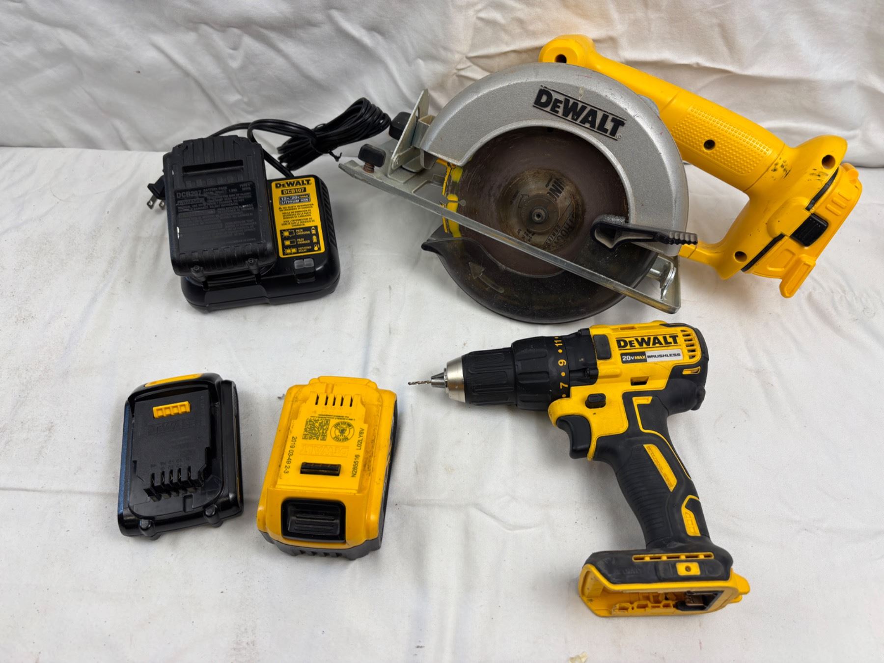 Includes a Cordless Drill Driver and a Circular Saw (both power on), various batteries