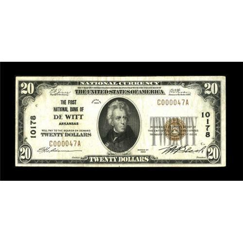 <B>DeWitt, AR</B></I> - $20 1929 Ty. 1 <B>The First NB</B></I> Ch. # 10178<BR> An evenly circulated Series 1929 example from the only bank in town to issue. <B>Very Fine.</B></I><BR><BR><b>Shipping:</b> Coins & Currency (<a target="_blank" href="http://www.heritageauctions.com/common/shipping.php">view shipping information</a>)
