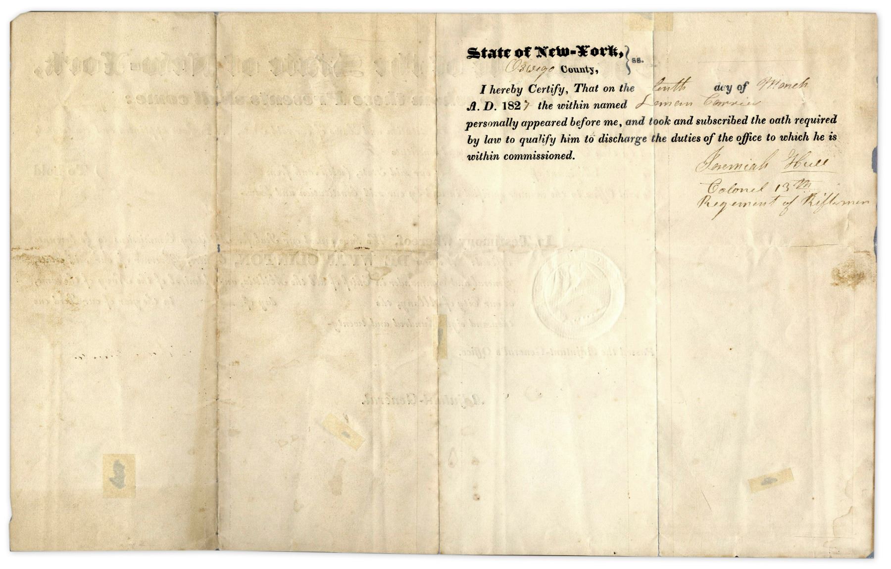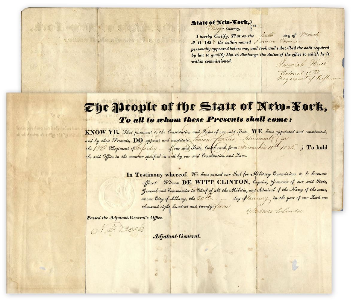 DeWitt Clinton document signed, dated 20 January 1827, during his second term as New York Governor. He appoints Leman Carrier to the rank of lieutenant in the 182nd NY Infantry by signing: ''DeWitt Clinton''. Clinton's political career, including terms as U.S. Senator and New York City Mayor, would end with his death a year later. His name was mockingly attached to ''Clinton's Ditch,'' later known as the Erie Canal, a crucial transport link. Minor paper loss to document has been repaired; separation along folds. Overall very good.