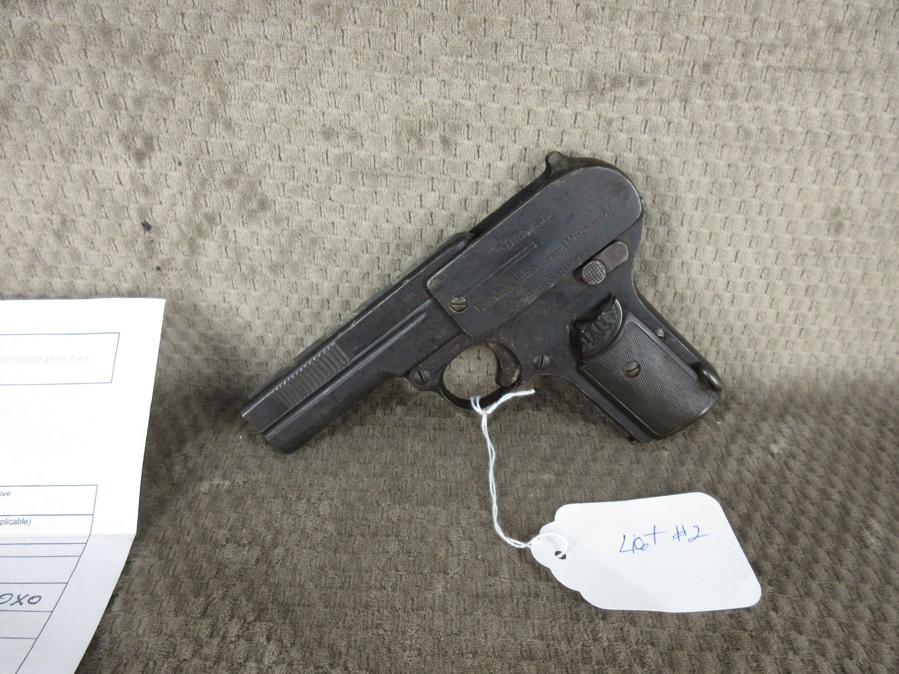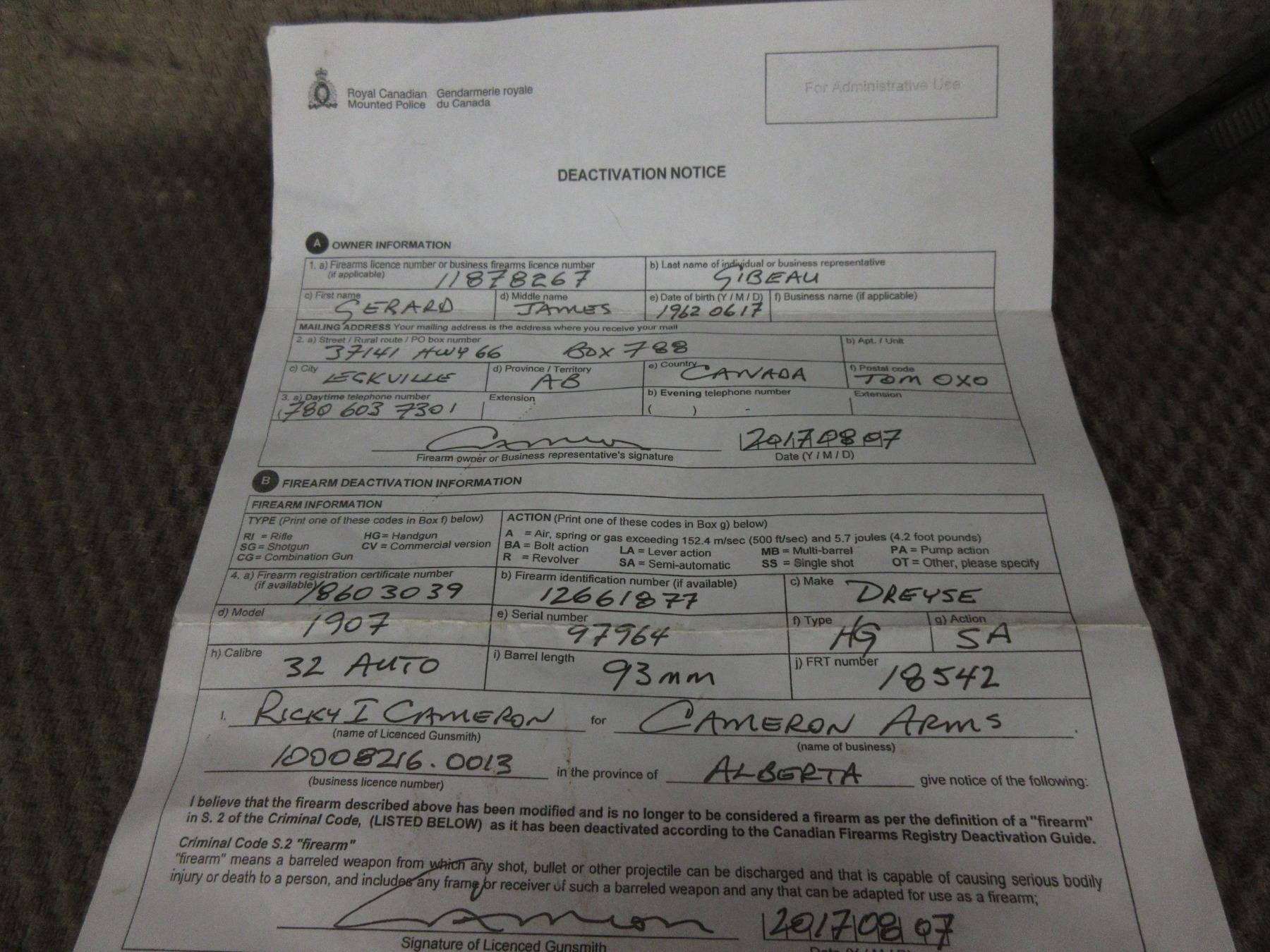 Deactivated Pistol - Dreyse Model 1907 with Deactivation Notice (don't know if it has been filed with the RCMP) - Bluing has wear, one grip has parts broken off and nothing moves.