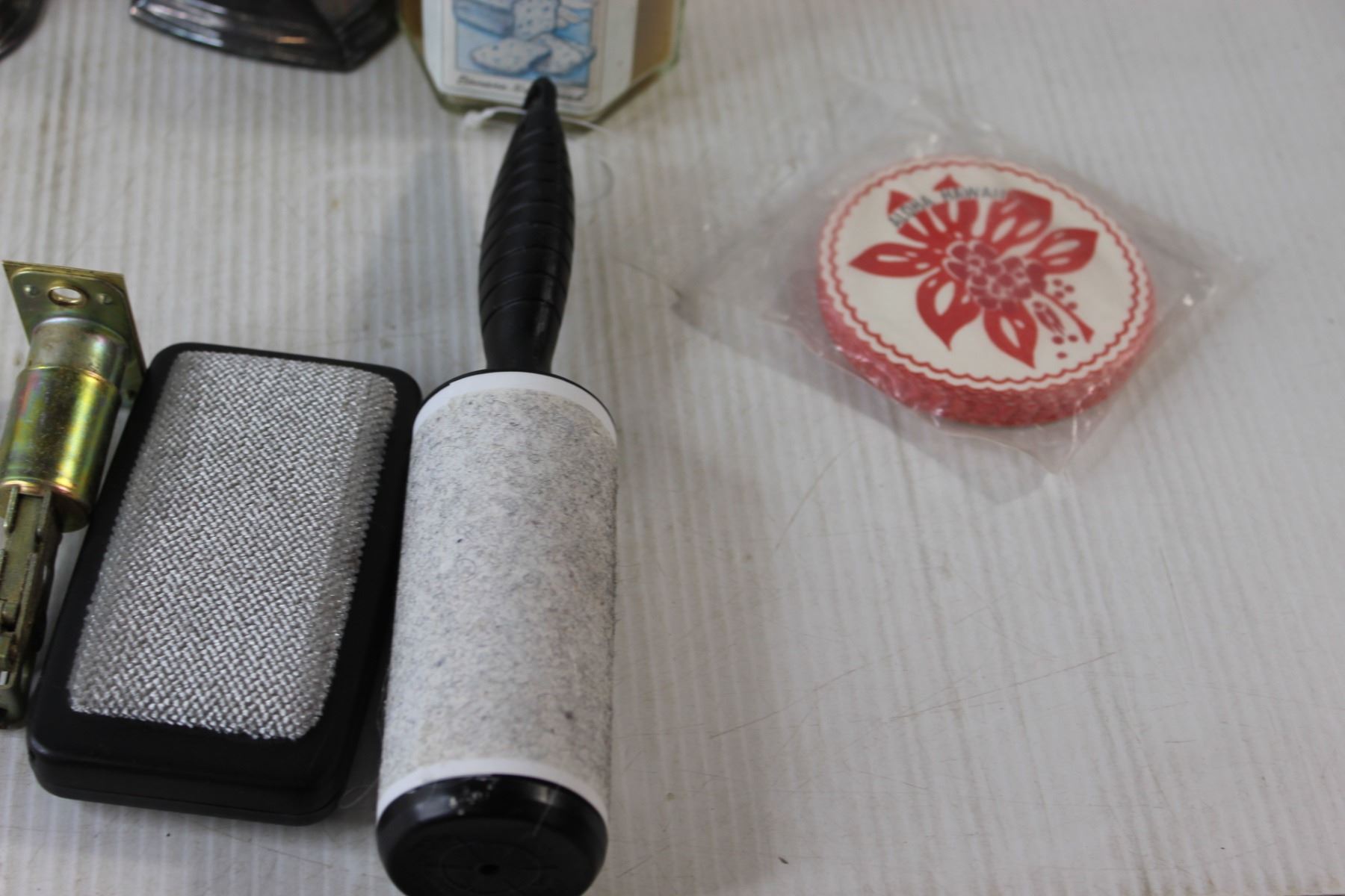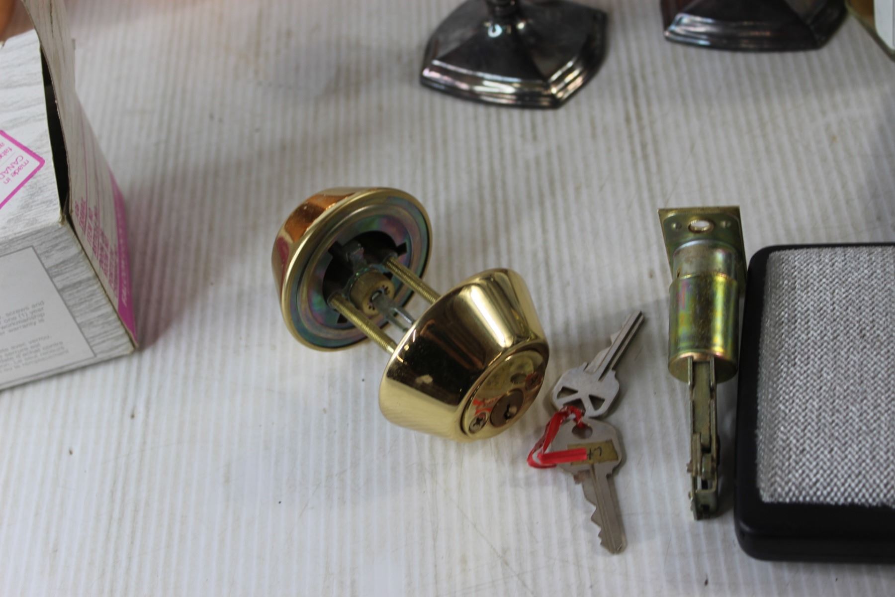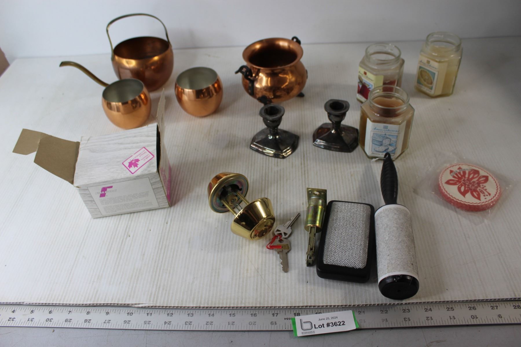 Dead Bolt with 2 Keys, (4) Small Copper Pots, (3) Candles, (2) Lint Brushes, (2) Silver Candlestick Holders
