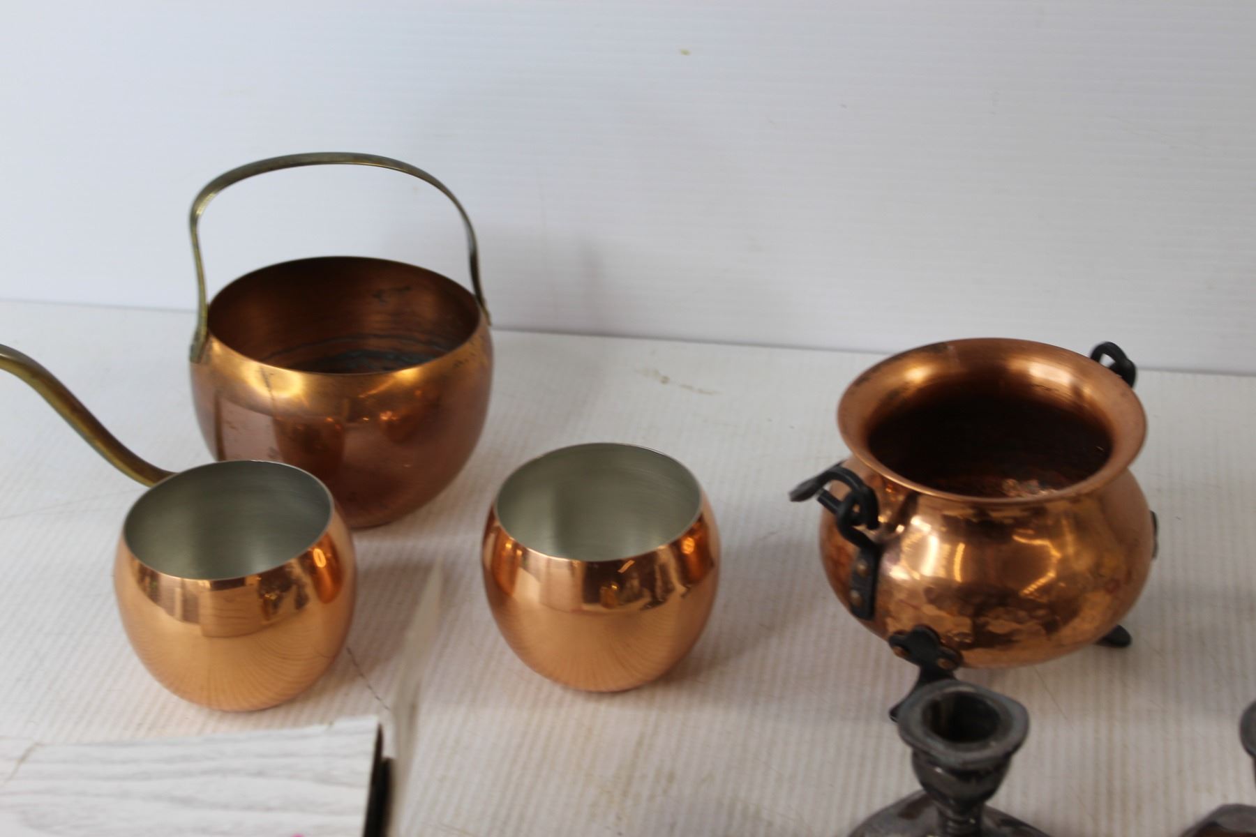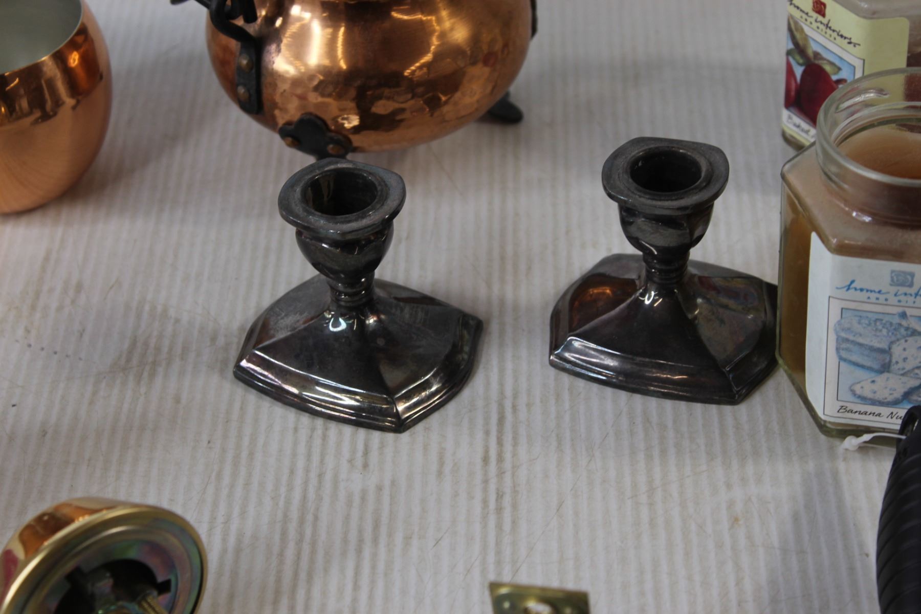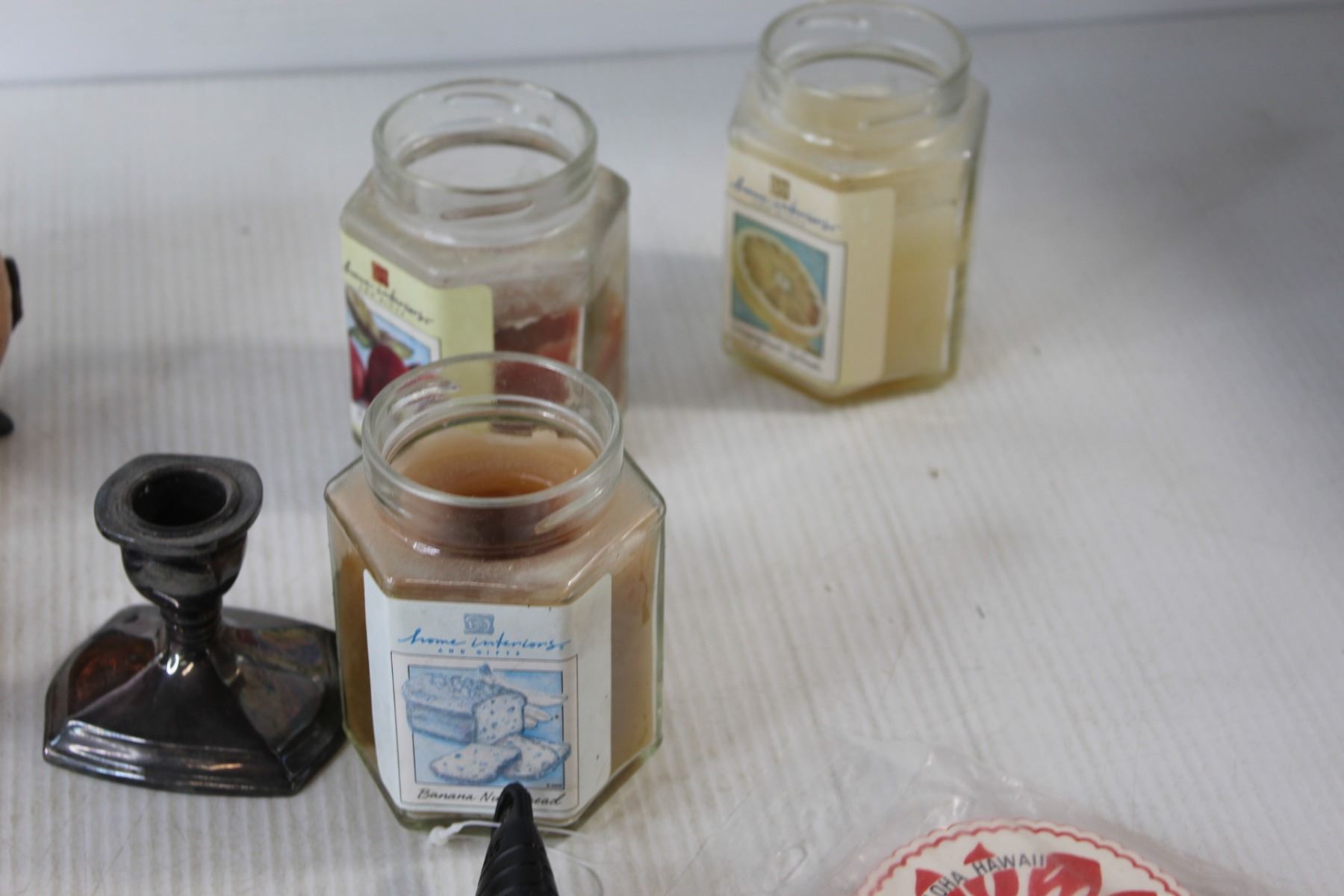 Dead Bolt with 2 Keys, (4) Small Copper Pots, (3) Candles, (2) Lint Brushes, (2) Silver Candlestick Holders