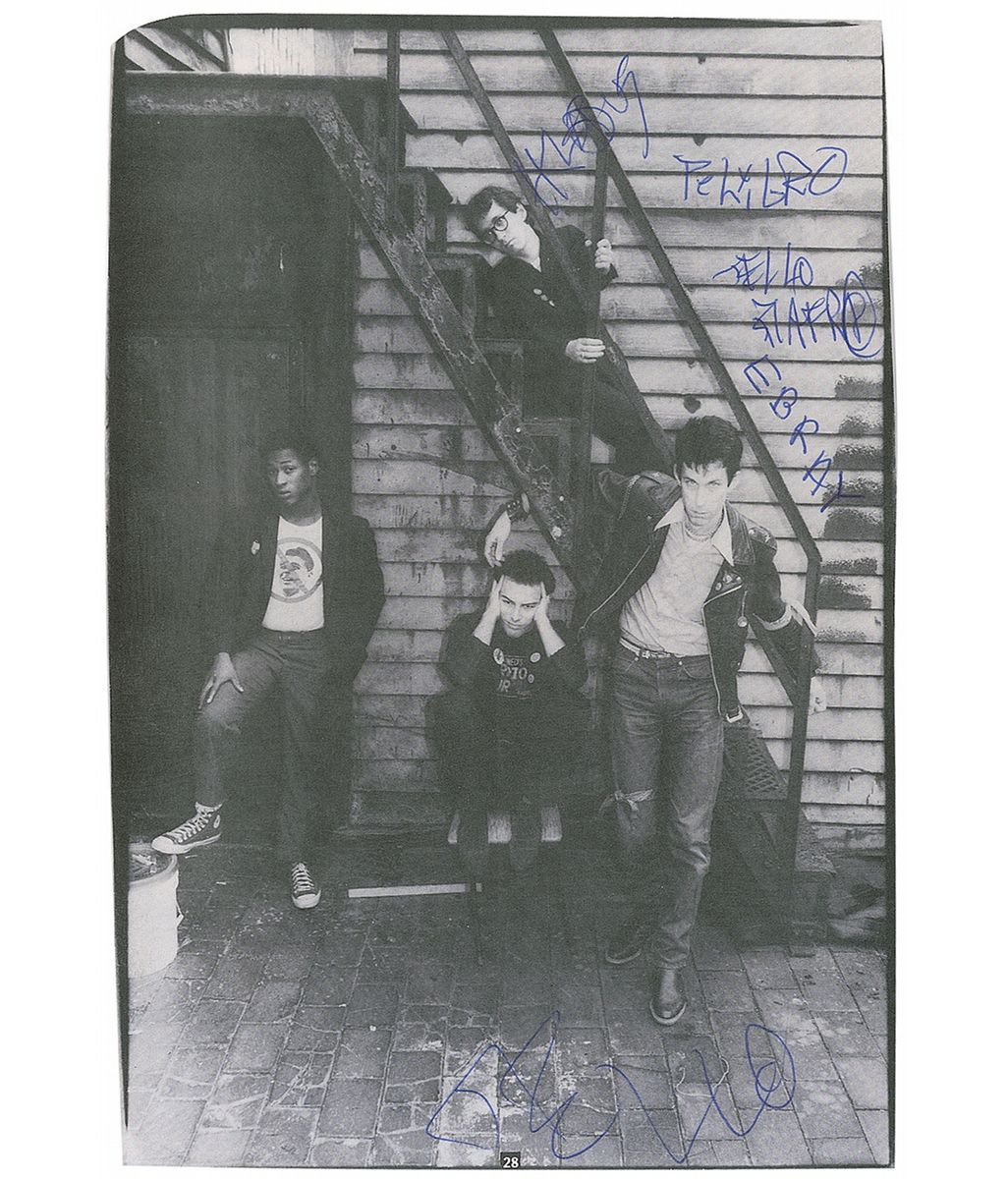 Rare 7 x 10.25 book photo of the group, signed in blue ballpoint by Jello Biafra, East Bay Ray, D. H. Peligro, and Klause Flouride. In fine condition.