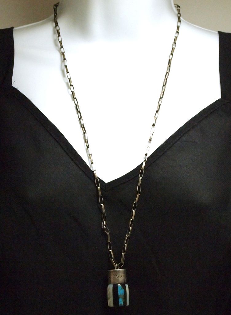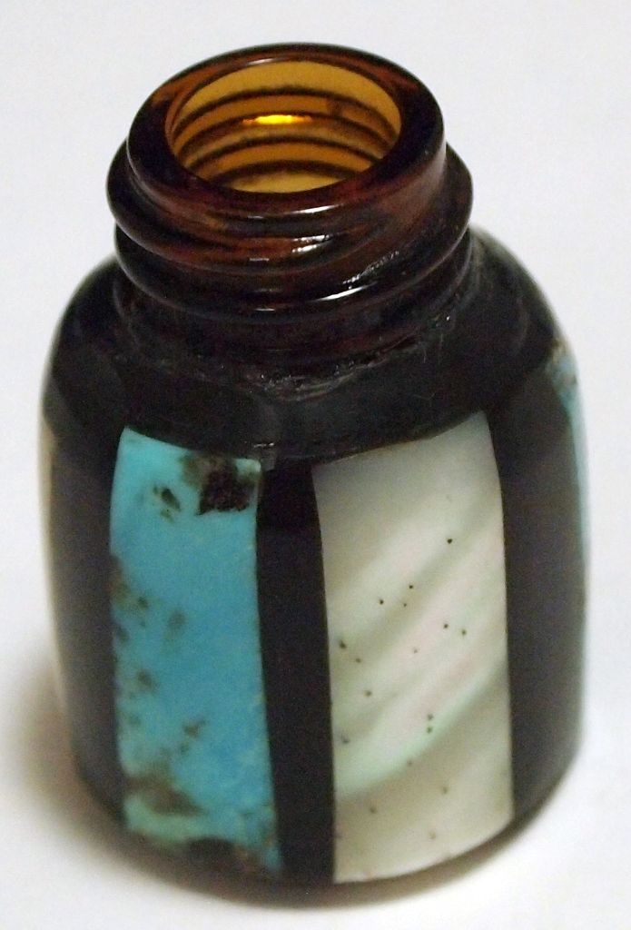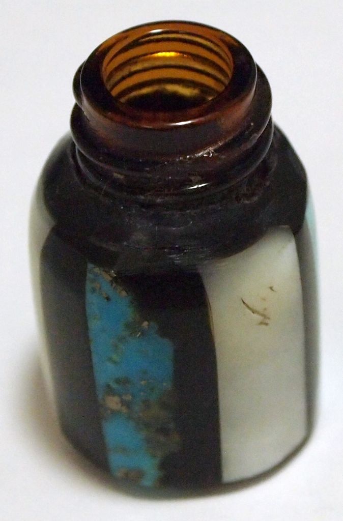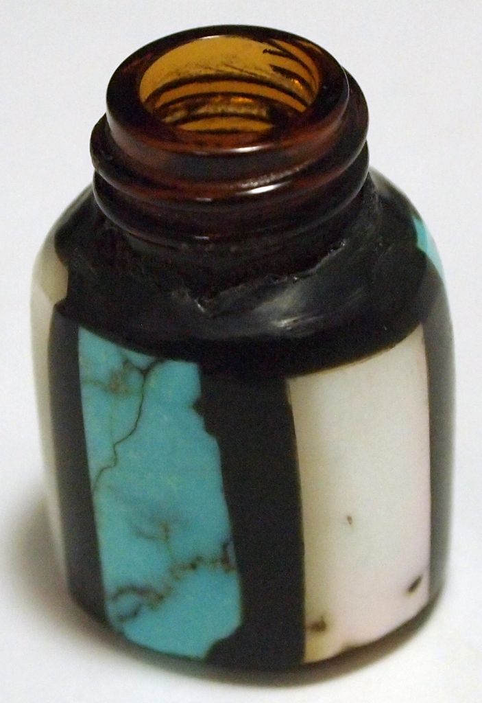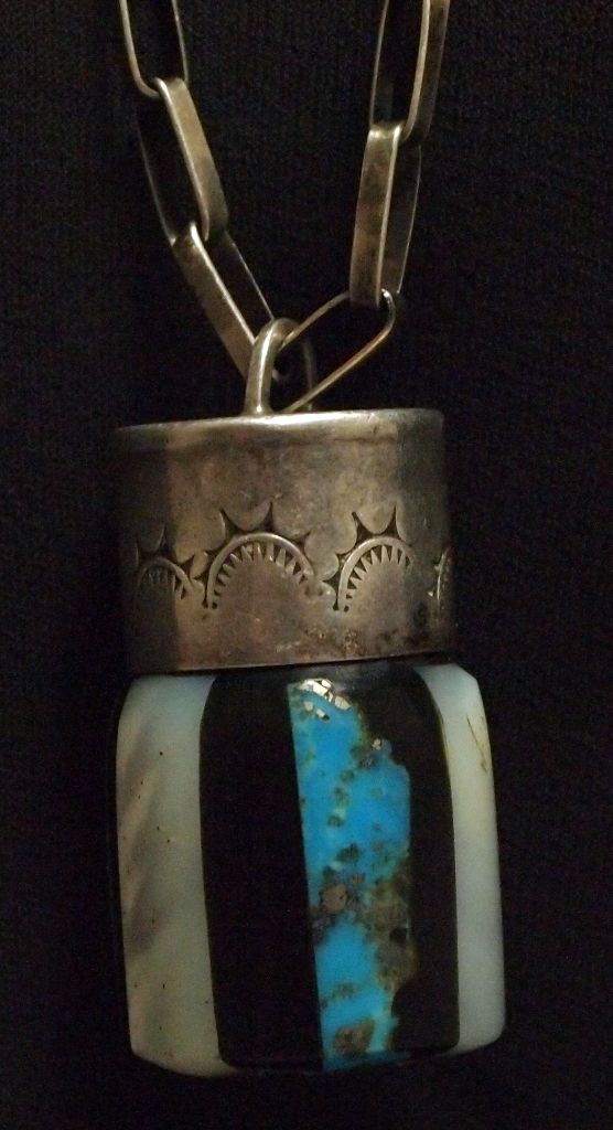 Measures 29" around by 1/8" wide. Container may have been a snuff container or just a general small container; has no discernable smell at this point. Container is brown glass covered in Turquoise, Mother of Pearl and Onyx inlay. Has a well-screwing cap covered in sterling silver. Chain is also sterling silver.