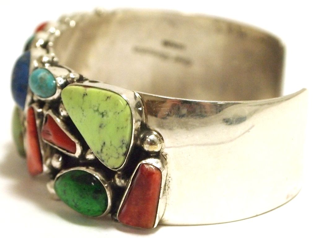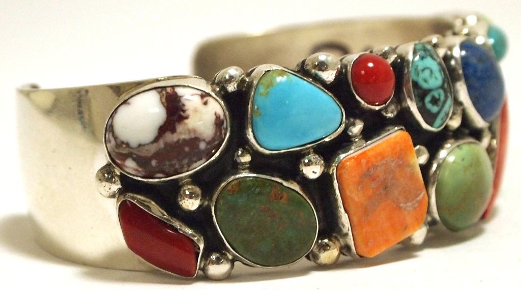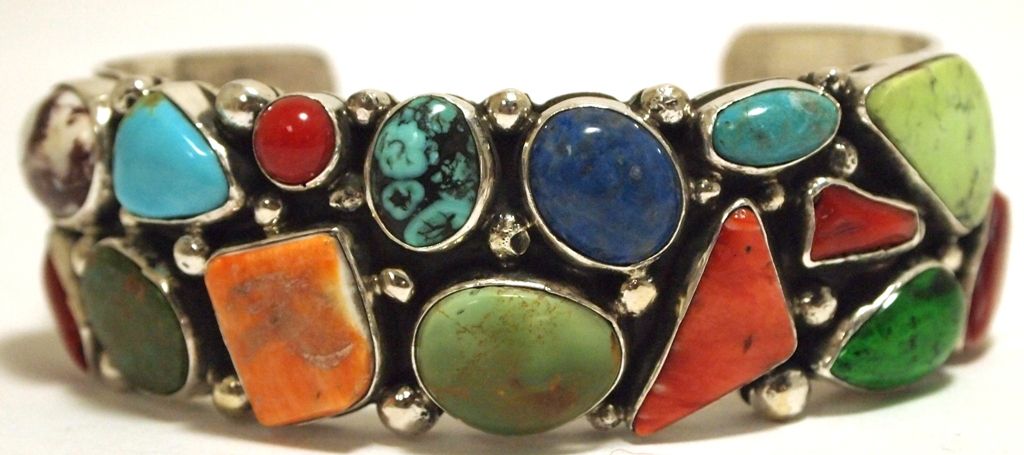 Measures 5-3/4" around with a 1-1/4" gap, 1" wide. Stones present: Denim Lapis Lazuli, Turquoise, Green Turquoise, Spiny Oyster, Wild Horse, Coral.