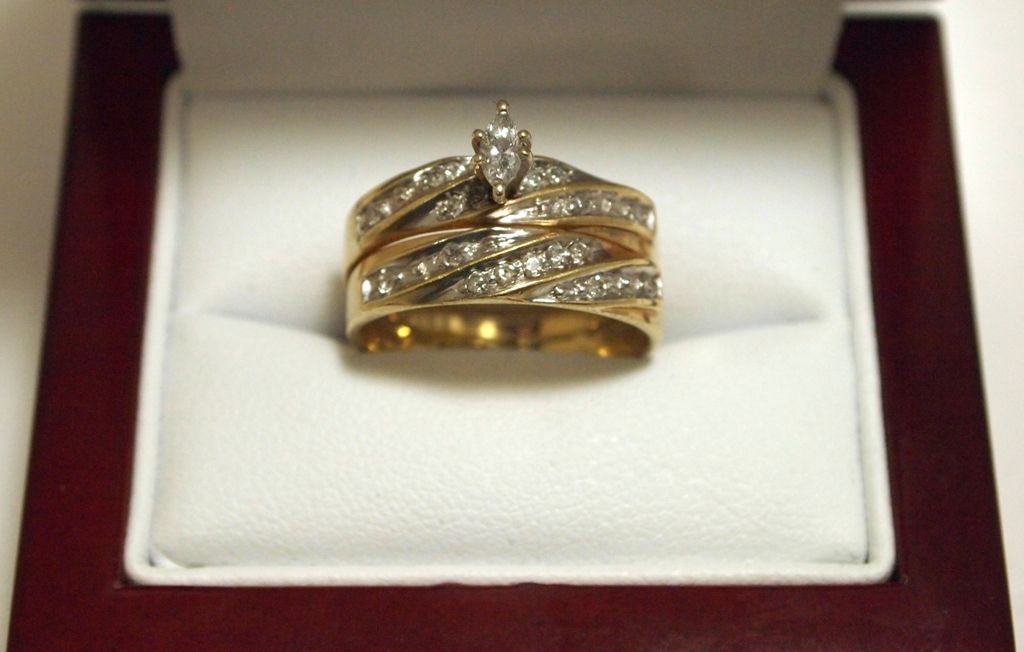 Band measures from 3/16" to 3/8" wide, size: 7.25. Oval-cut diamond measures approximately 3/16" tall by 3/32" wide. There are 17 smaller round-cut diamonds surrounding the oval-cut, each measuring approximately 1/32" in diameter. Diamonds have been tested genuine but we do not have carat information.