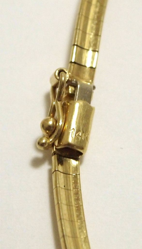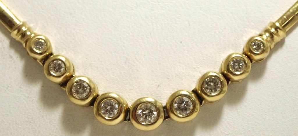 Necklace measures 17" around by from 1/8" to 1/4" wide. Contains 9 round-cut diamonds ranging from approximately 1/16" to 1/8" wide. Weight: 21.4g.