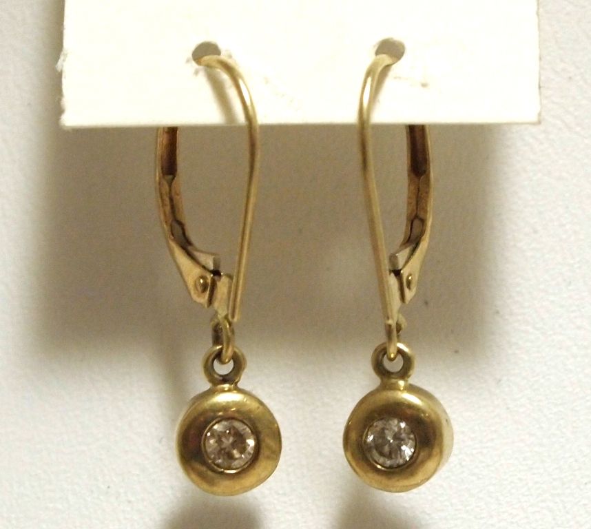 Clasping hook earrings measure 15/16" tall by 1/4" wide. Each has a round-cut diamond measuring approximately 1/8" in diameter. Weight: 1.8g. Diamonds have been tested genuine but we do not have carat information.