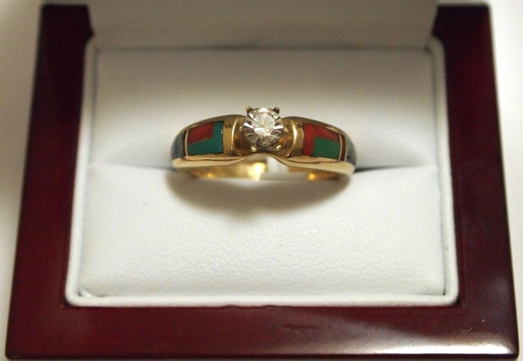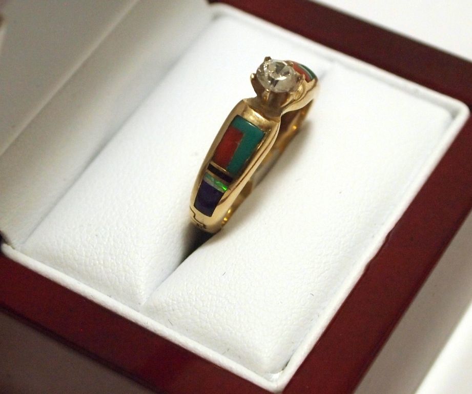Two inlays measure 5/32" tall by 1/2" around on each side. Band measures from 1/16" to 7/32" wide, size: 7.25. Round-cut diamond measures approximately 3/16" in diameter. Diamond has been tested genuine but we do not have carat information. Inlay stones present: Green Turquoise, Coral, Sugilite, Opal, Onyx.