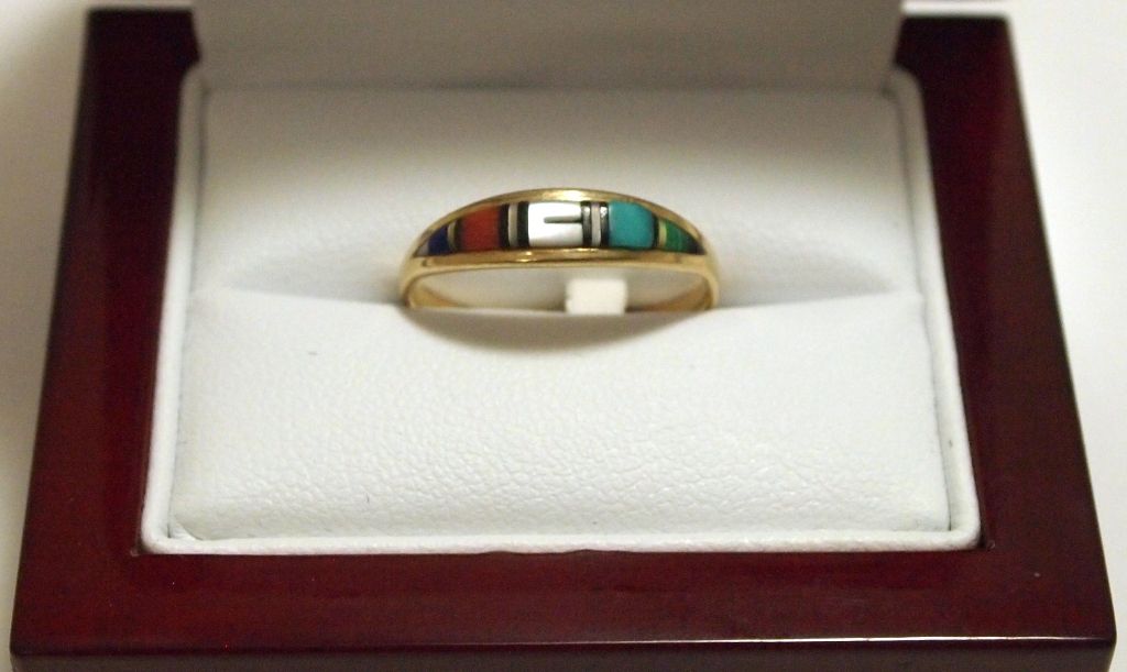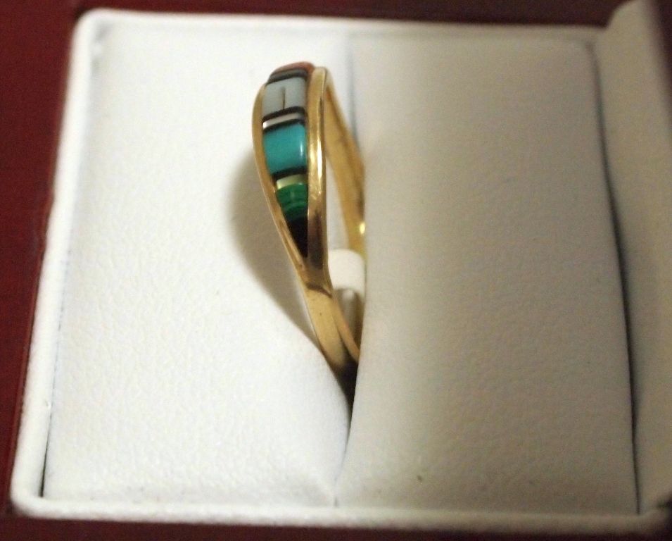 Inlay measures 1/8" tall by 3/4" around. Band measures from 1/16" to 3/16" wide, size: 6.5. Stones present: Coral, Turquoise, Malachite, Mother of Pearl, Onyx, Lapis Lazuli.