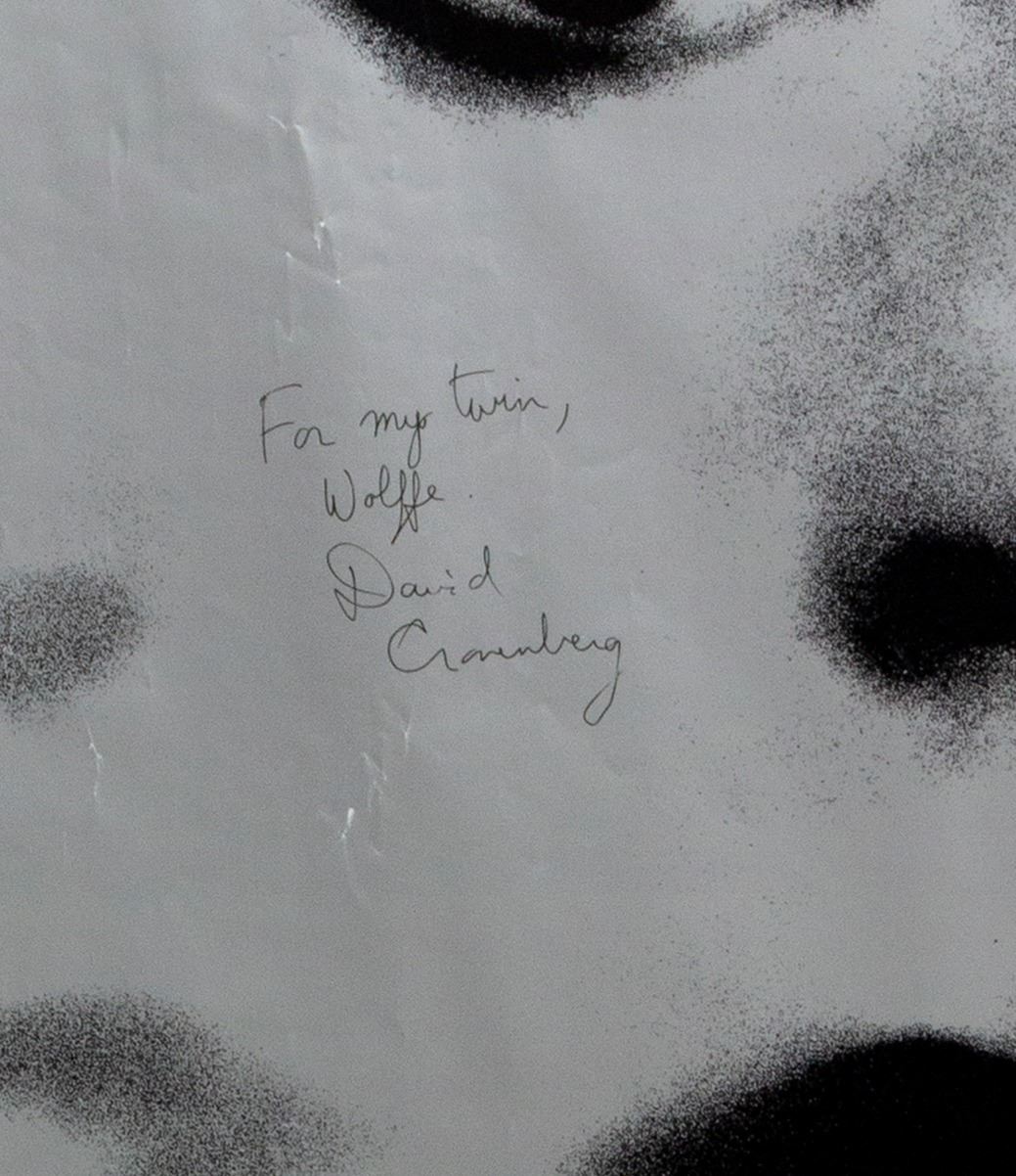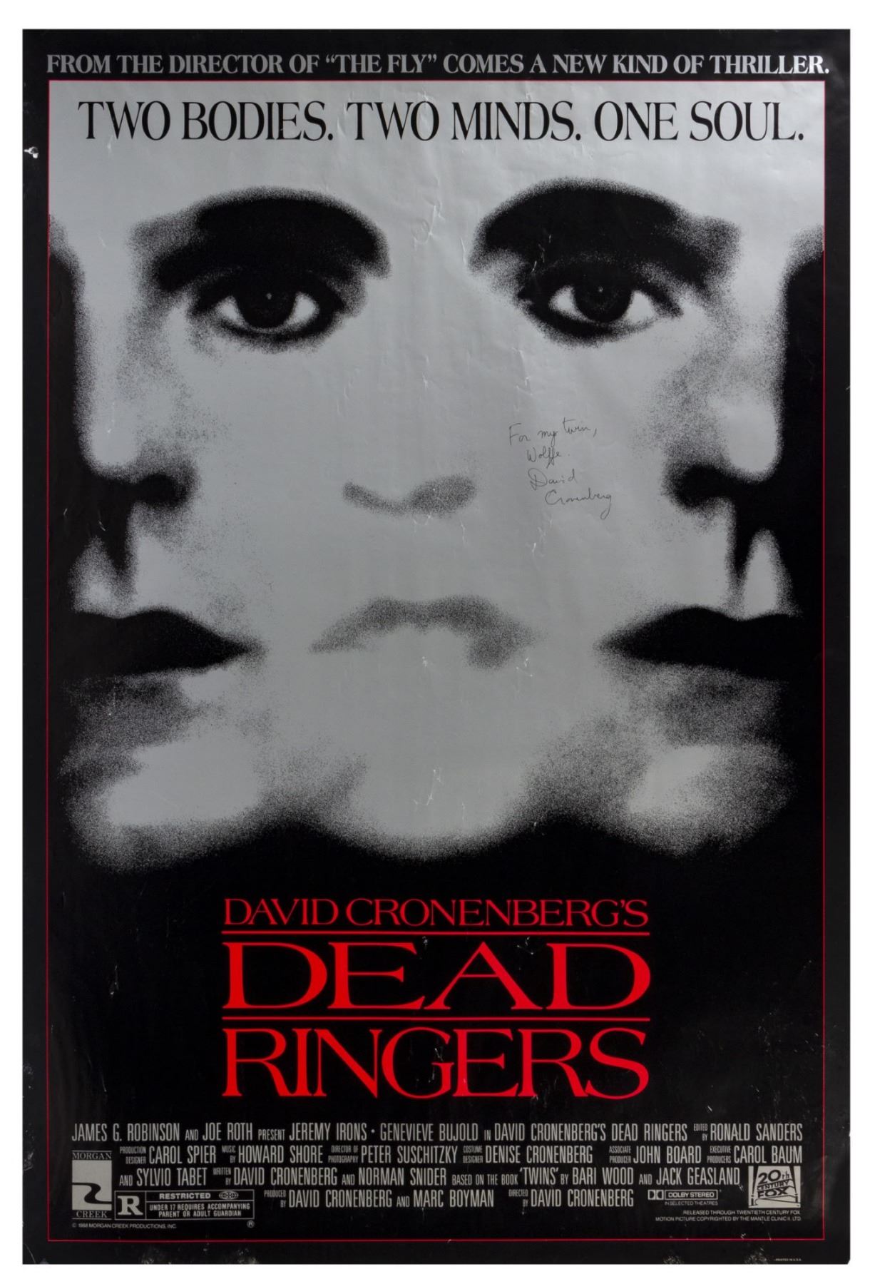 (20th Century Fox, 1988) An original one sheet poster for "Dead Ringers", a psychological horror film by David Cronenberg. The poster was signed by Cronenberg to Director John Landis and reads "For my twin" above Cronenberg's signature. The poster measures 39.75"x27" and is in fair condition with some scratches and creasing throughout, edge-wear, and a small puncture mark near the left-edge.