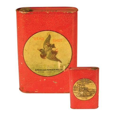 Dead Shot Gun Powder Tin. American Powder Mills Co., Boston, Mass. A dent in back and some scratches otherwise good condition. 4 X 6 X 1 inches.