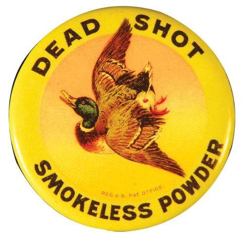Celluloid Pinback advertising Dead Shot Smokeless Powder. Excellent condition. 1 1/4 inch diameter.