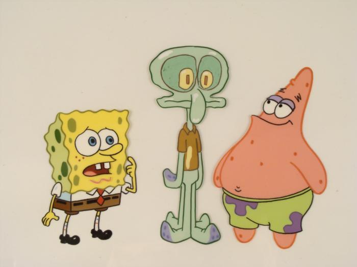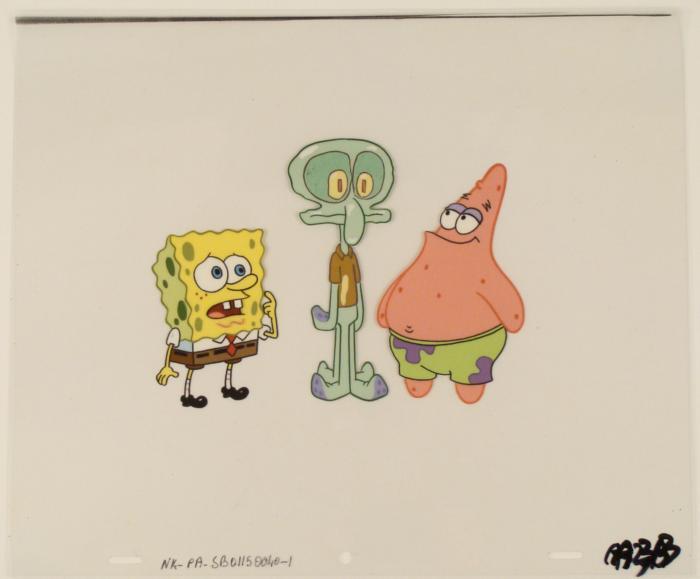 This original animation cel is from the Nickelodeon TV show SpongeBob Squarepants. The story takes place under the deep blue sea in Bikini Bottom, where SpongeBob resides. SpongeBob, who is a yellow, porous sponge, is your typical happy-go-lucky character, as he is always cheerful and enjoys making people laugh. Patrick Star, SpongeBob's neighbor who is a starfish, is your average children's show idiot, as he boasts knowing nothing and is often getting himself into ridiculous situations. Between the homes of these two lies the home of the miserable Squidward, a squid, who is known for being grouchy and playing tricks on SpongeBob and Patrick. Both SpongeBob and Squidward work at the Krusty Krab, a fast food business run by the greedy money-loving Mr. Krabs, a crab, the arch rival of the evil, possibly misunderstood, Plankton. Another neighbor, Sandy Cheeks, an athletic squirrel who normally wears an astronaut's space suit, was introduced in "Tea at the Treedome." She spends most of her time inventing and experimenting. Is Squidward dead?Original Production Animated Cel Overall Size of Cel: 10 1/2" x 12 1/2" Very Good ConditionThis is an original hand-painted cel set-up used in the production of an episode of "SpongeBob SquarePants." Each one-of-a-kind set-up represents a slight change in position of the characters. When individually photographed and projected in rapid succession, the images appear to move.