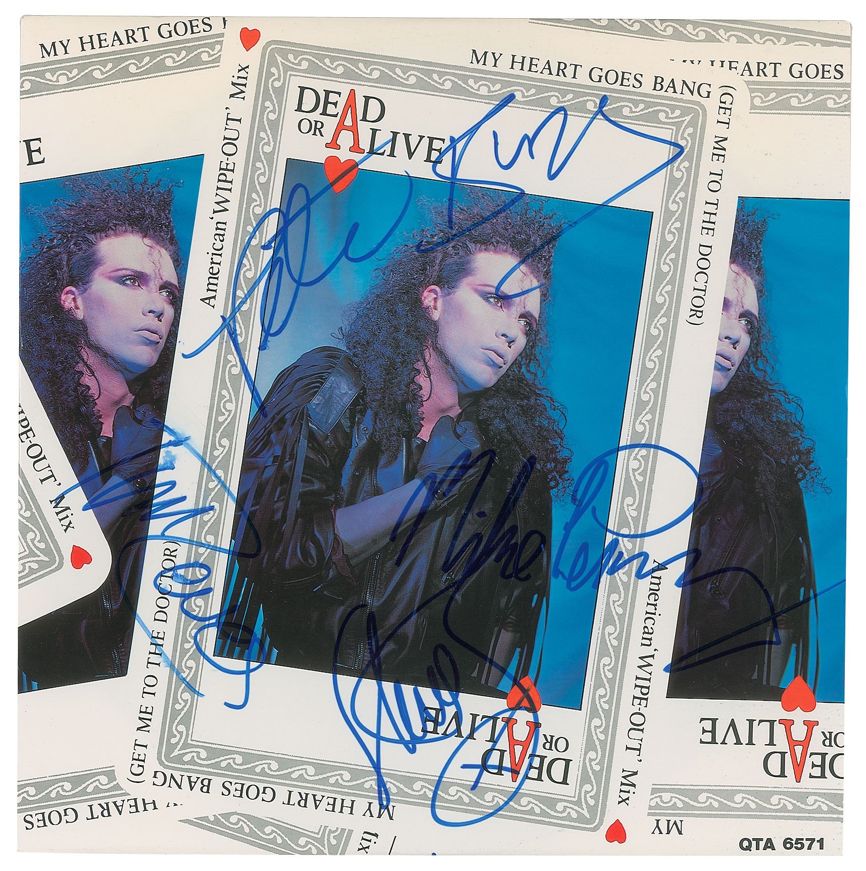 'My Heart Goes Bang (Get Me to the Doctor) / Big Daddy of the Rhythm (Live)' single album signed on the front cover in blue felt tip by Pete Burns, Steve Coy, Mike Percy, and Tim Lever. In fine condition. The record is included.