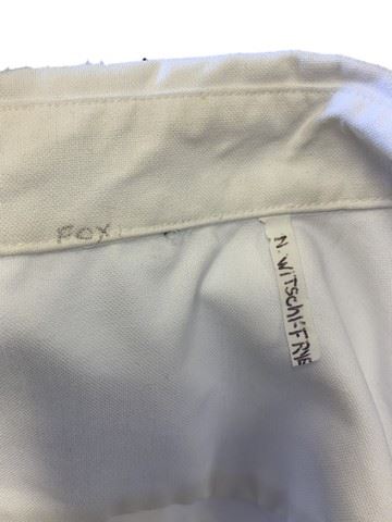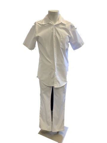 Deadpool 2 (2018) - Head Orderly Frye (Nikolai Witschl) screen worn, sanitarium guard costume with white button up shirt, and white fabric pants. On shirt's back inside collar, "Fox" is written and on the tag and "N. Witschl - Frye". On pants inside back "NW" is written.
