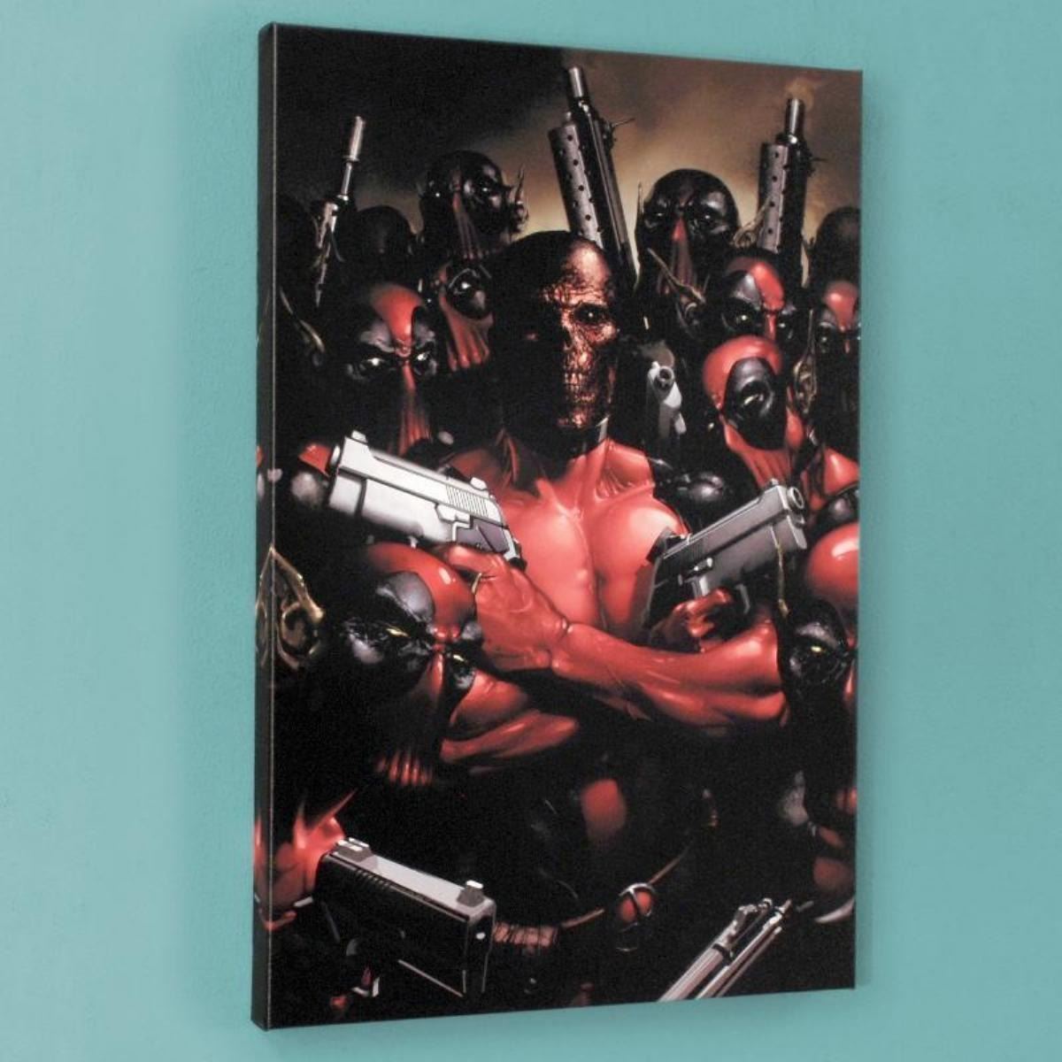 A piece of comic book history, this limited edition, from original art by Clayton Crain, depicts a multitude of Deadpools. Clayton Crain is an American comic book artist, who primarily uses digital painting techniques in his art. He is best known for his works on Ghost Rider: Road to Damnation, Venom vs. Carnage and Sensational Spider-Man (vol. 2). Crain's current work is X-Force for which he does both the covers and interior art. "Deadpool #2" is a limited edition giclee on canvas by Clayton Crain presented by Marvel Comics! This piece comes gallery wrapped. Includes Certificate of Authenticity! Measures approx. 18" x 27" (image).