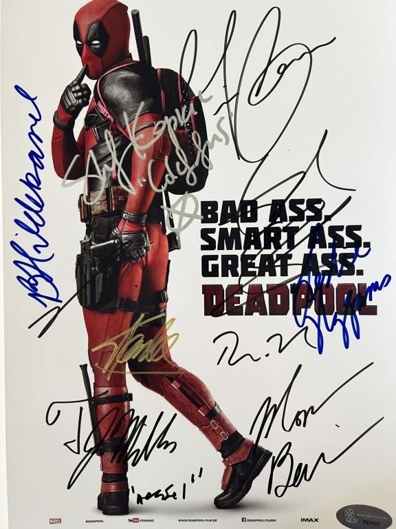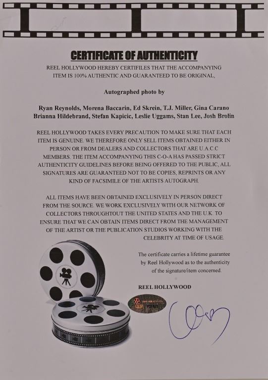 Deadpool cast signed photo. Autographed by Ryan Reynolds, Morena Baccarin, Ed Skrein, T.J. Miller, Gina Carano, Brianna Hildebrand, Stefan Kapicic, Leslie Uggams, Stan Lee, and Josh Brolin. 8x10 inches. HL20516