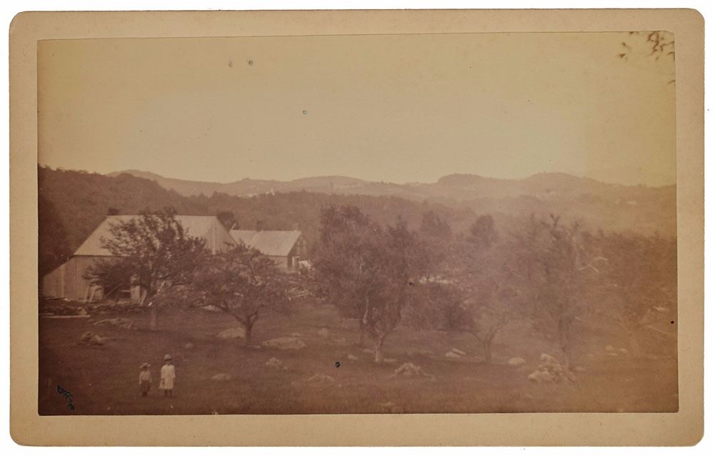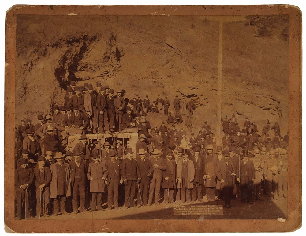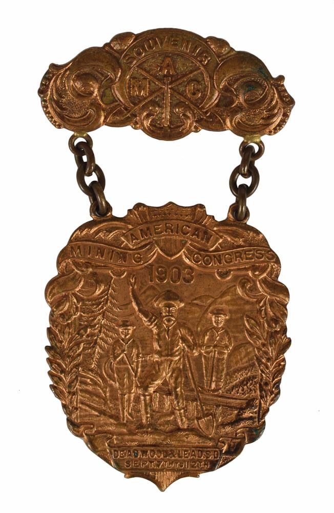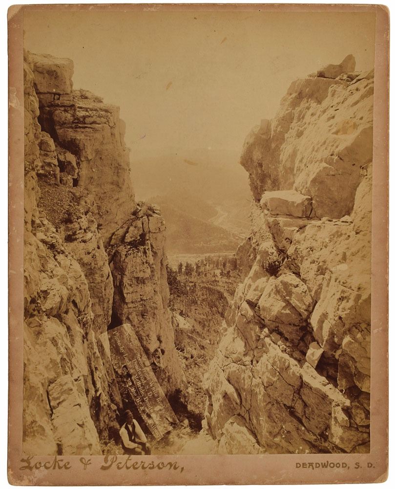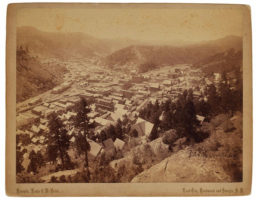 Impressive collection of four circa 1890s photographs and a 1903 badge related to Deadwood, South Dakota: an outstanding 13.75 x 10.75 mounted albumen photo by John C. H. Grabill, entitled "No. 3583. 'Last Deadwood Coach.' The last trip of the famous Stage Dec. 28 '90"; an 8 x 10 mounted albumen photo by Locke & Peterson, entitled "No. 7. 'Scene from White Rocks.' Deadwood, S.C."; a 10 x 8 mounted albumen photo by Rounds, Locke & McBride, entitled "Deadwood, S.D., Looking Southeast"; an unlabeled 8 x 5 mounted albumen photo of a mining town; and an uncommon 1903 American Mining Congress badge by Whitehead & Hoag, measuring 1.75 x 3.25, listing "Deadwood and Lead, S.D." as the host towns for the meeting. In overall very good to fine condition, with significant chipping and wear to the mount of the Grabill photograph. Grabill took some of the most iconic photos of Deadwood and the Black Hills, capturing the miners, cowboys, Native Americans, and natural landmarks of the area. A similar example of the "Last Deadwood Coach" photograph is held in the Library of Congress.
