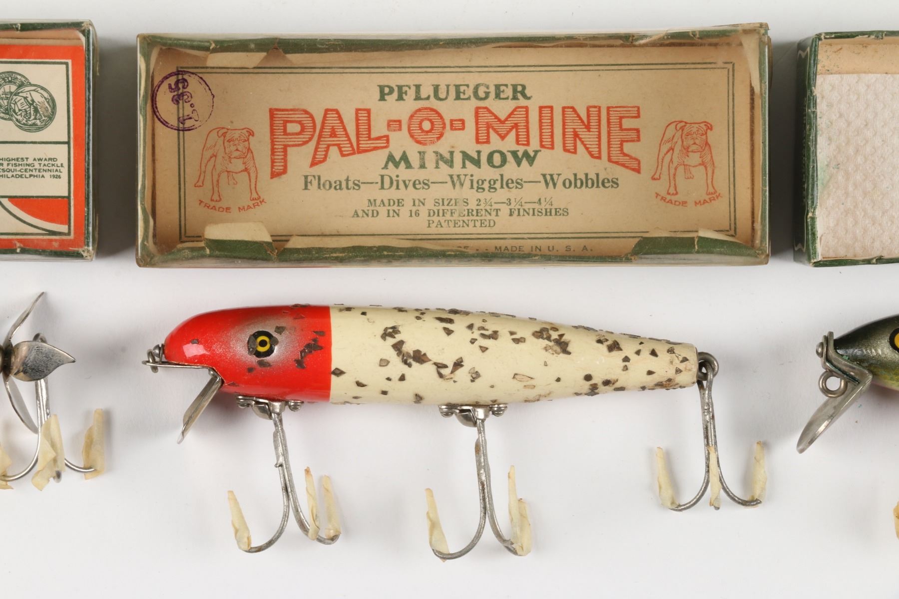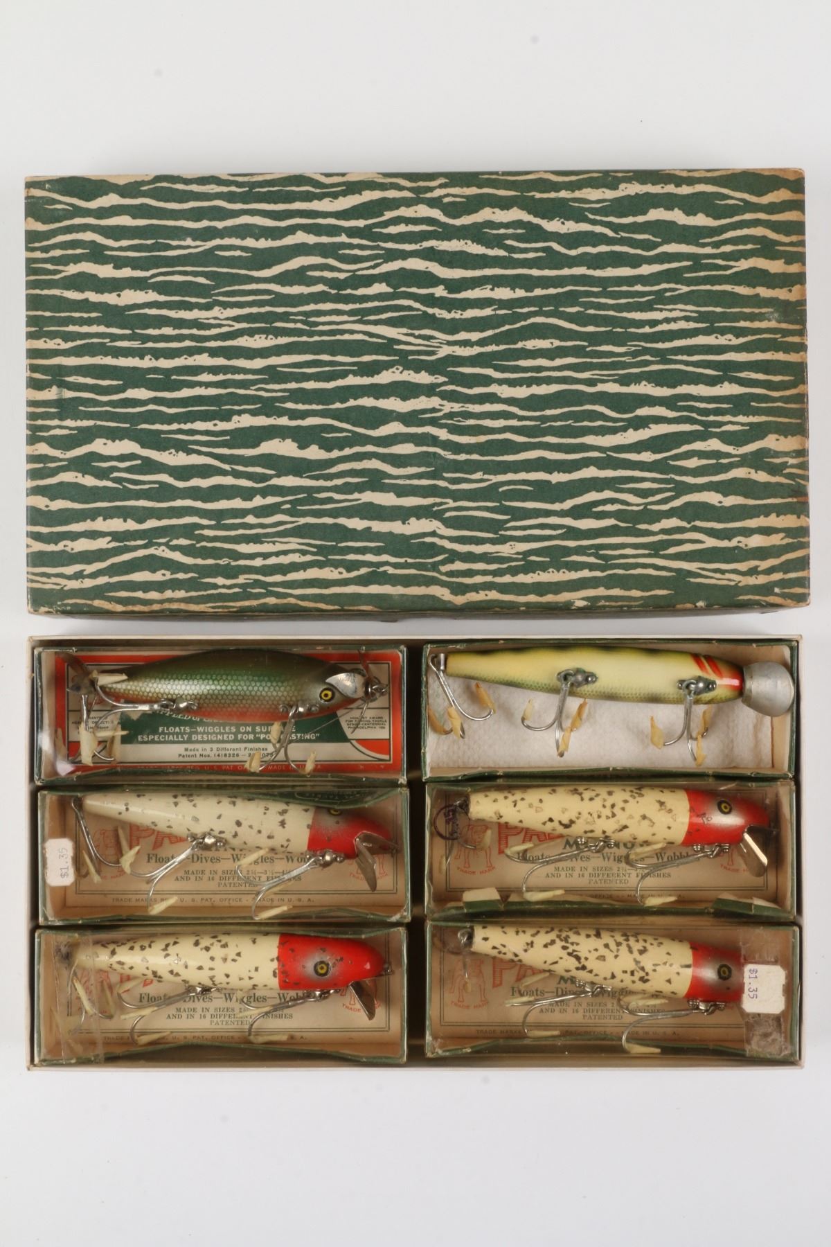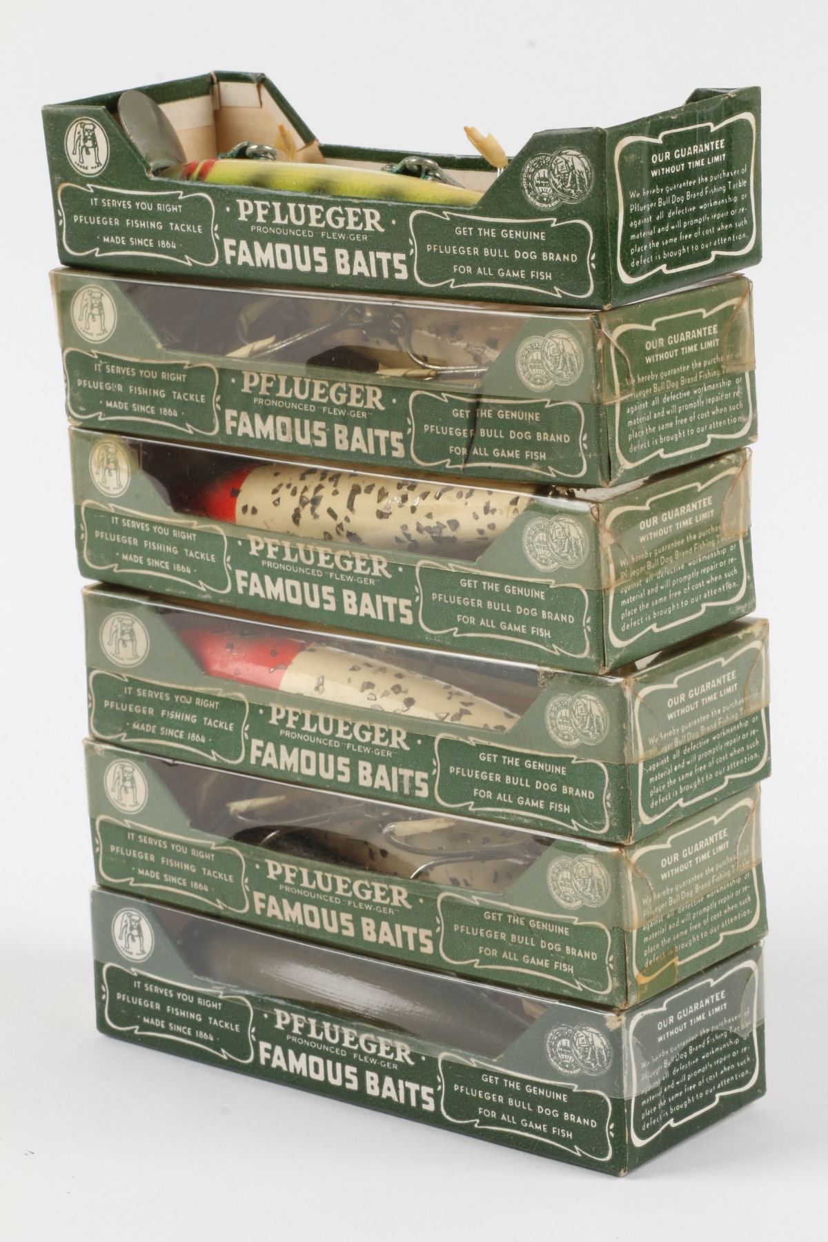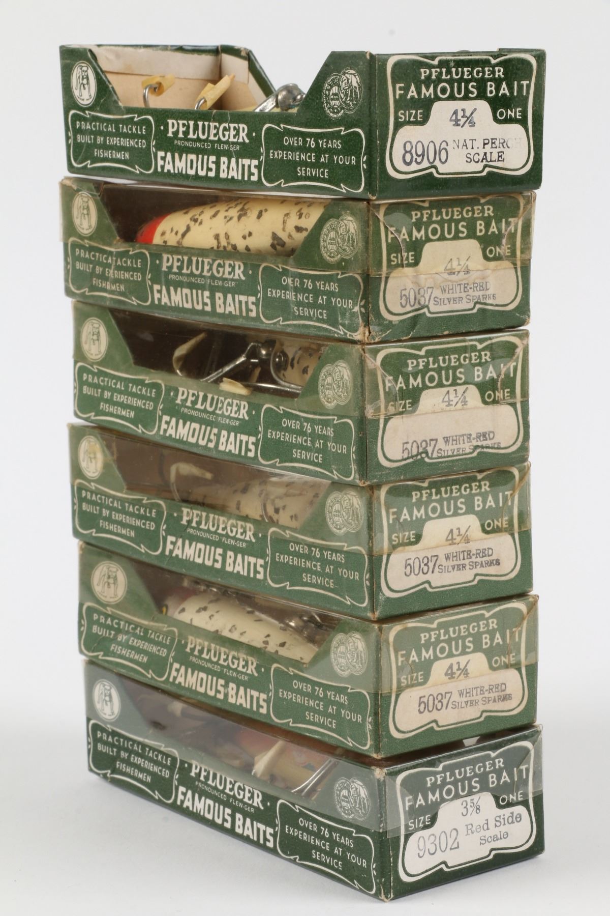 Pflueger, United States. 1950s. Boxed. Palomine, Scoop. Material: Wood. Quantity: 6. Grade: VG. 5" boxes. Est. $100-125.