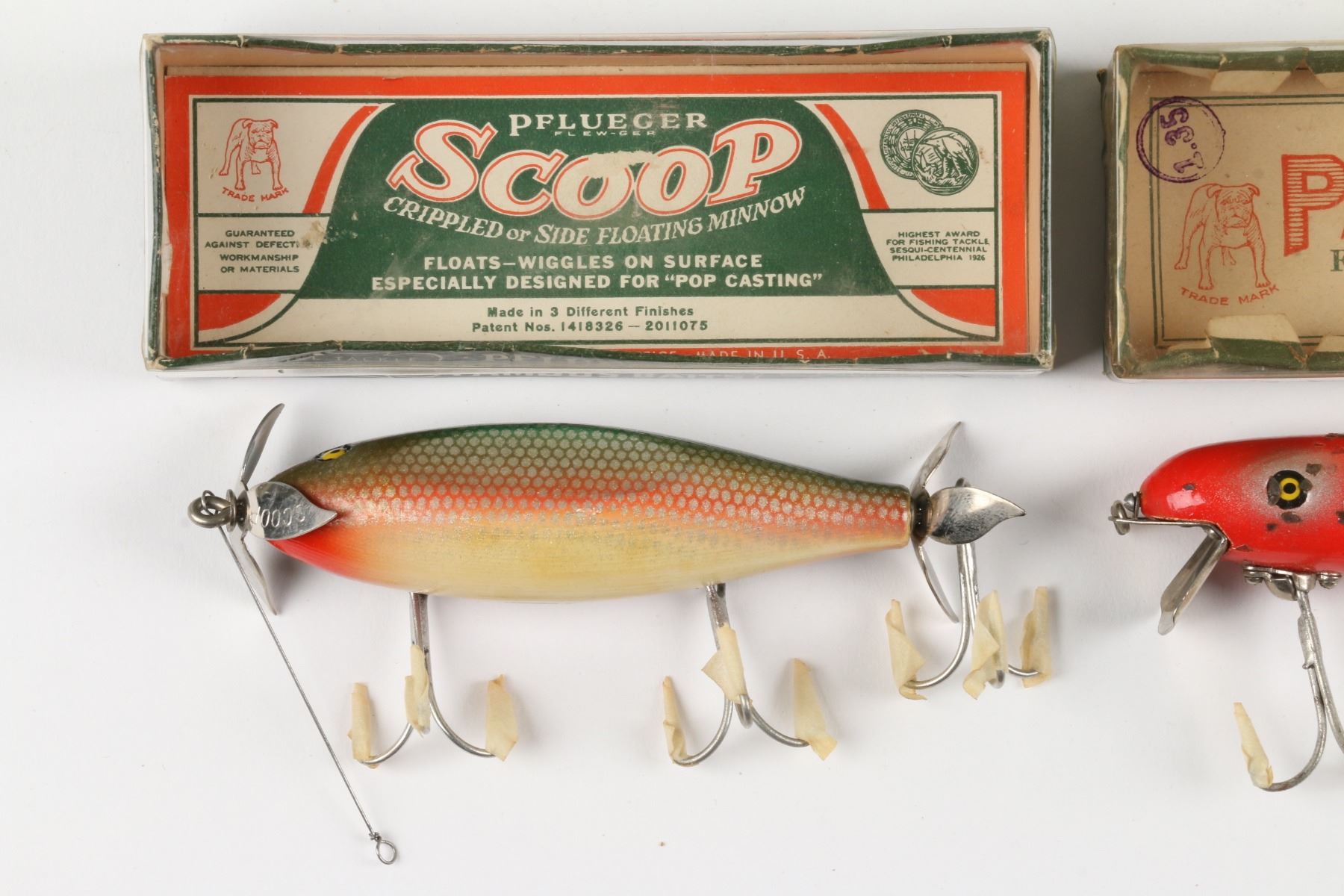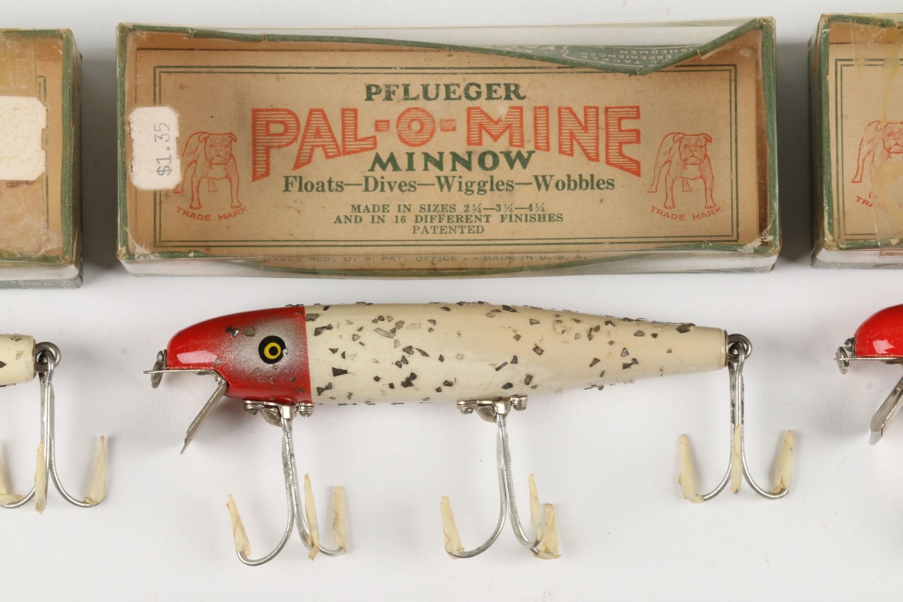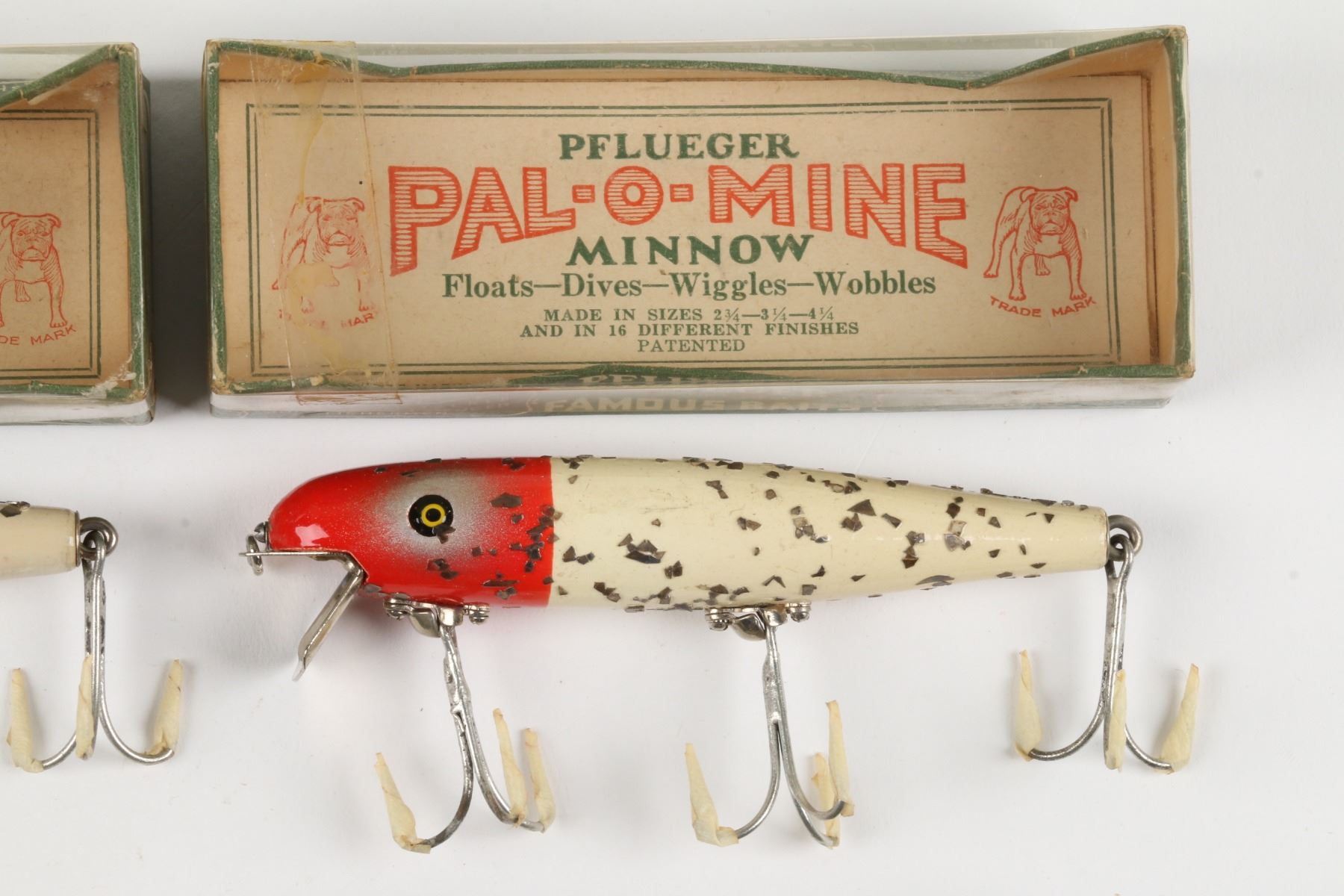 Pflueger, United States. 1950s. Boxed. Palomine, Scoop. Material: Wood. Quantity: 6. Grade: VG. 5" boxes. Est. $100-125.
