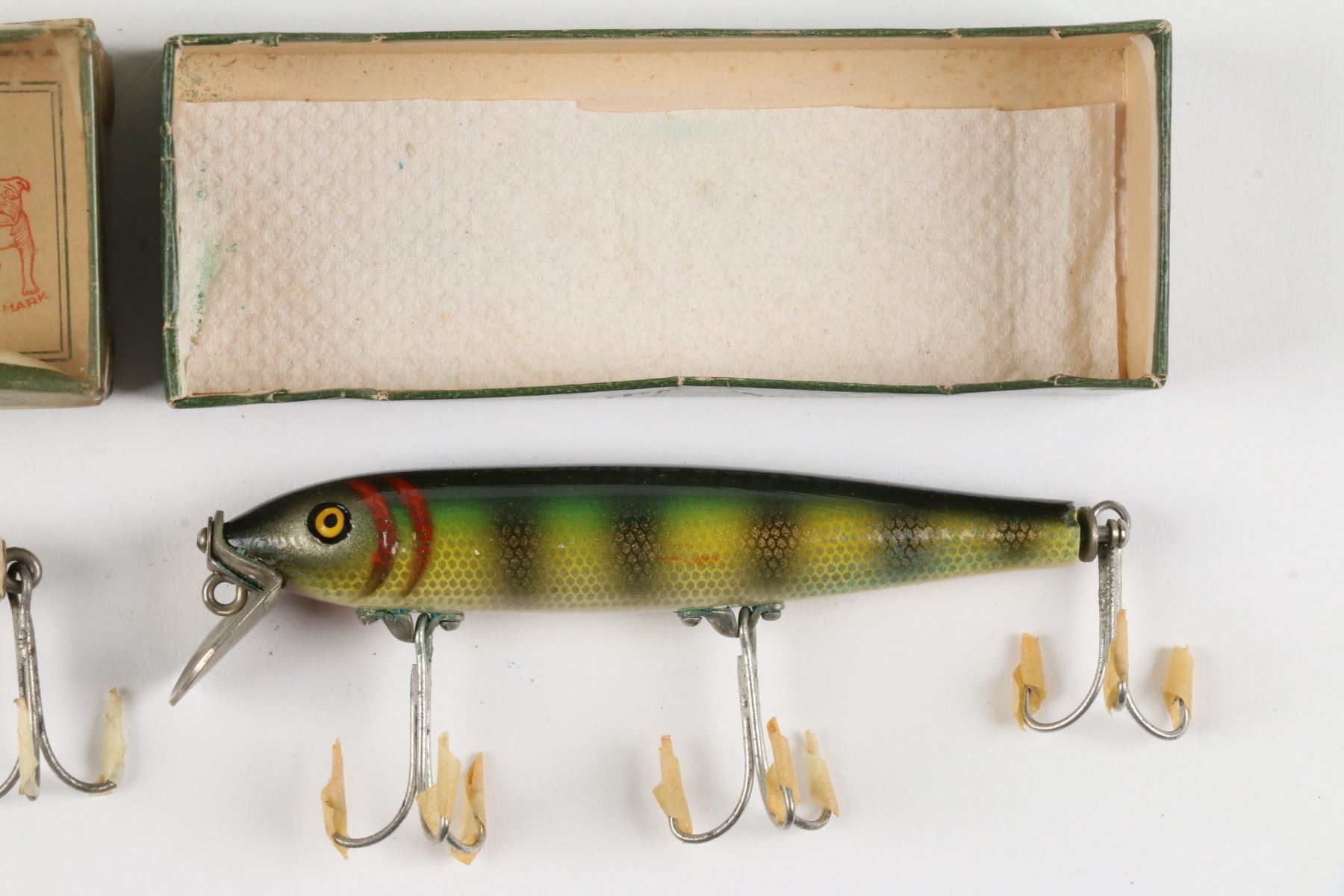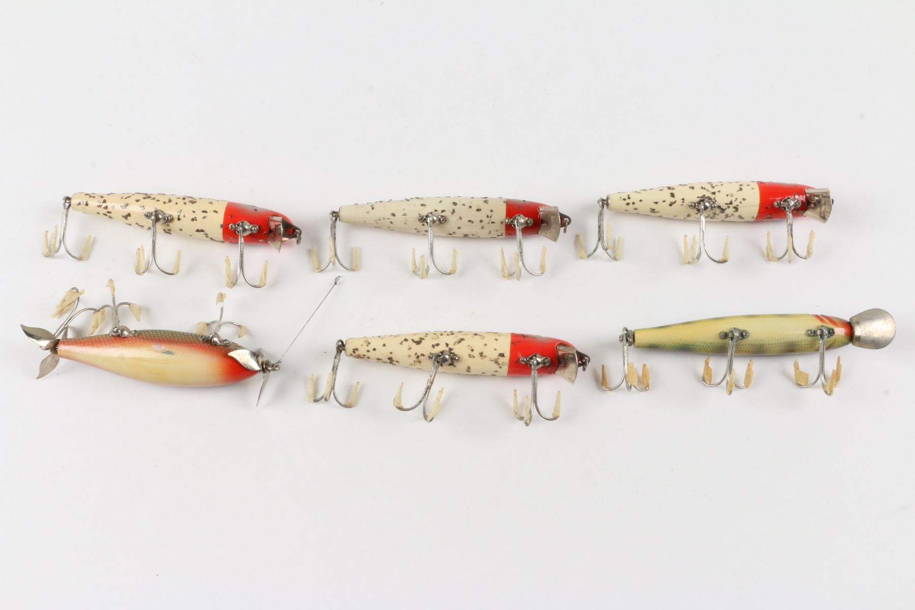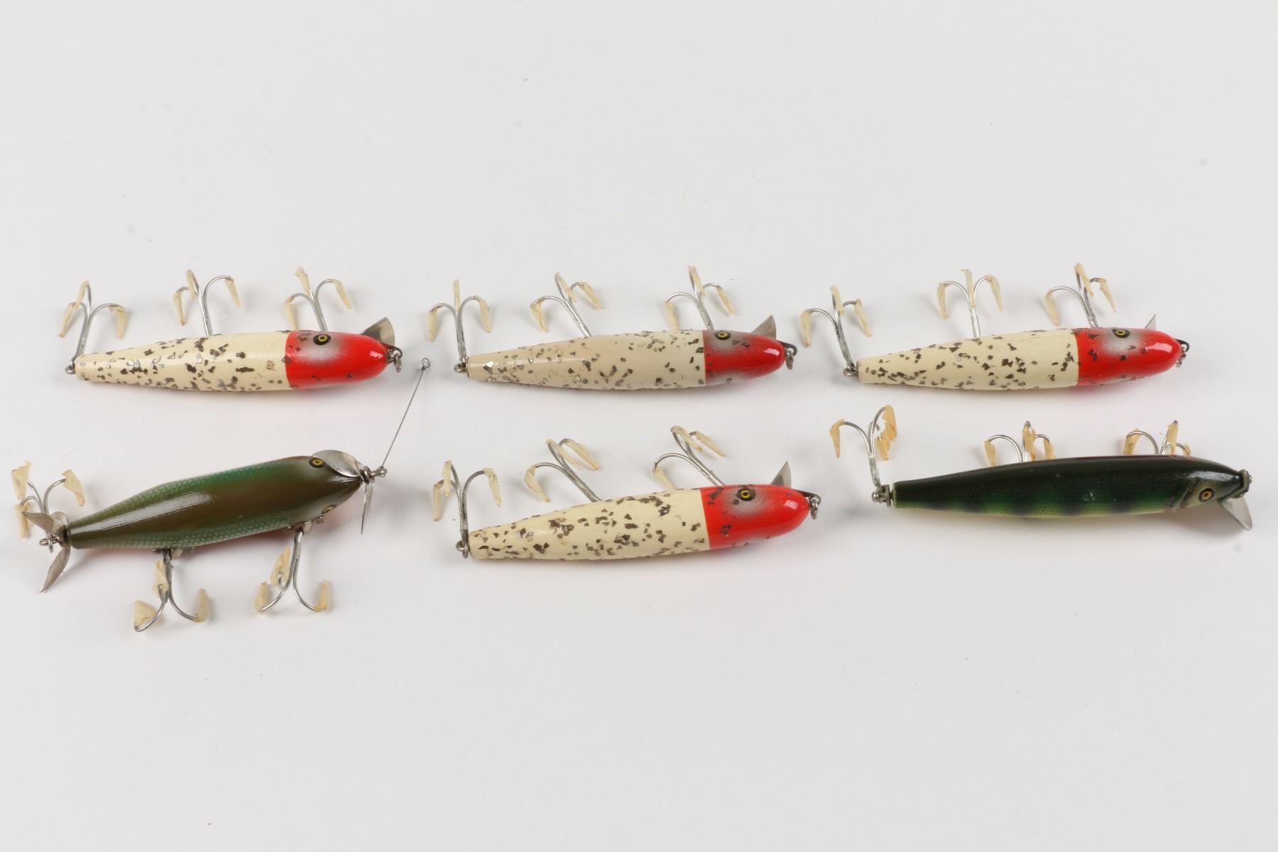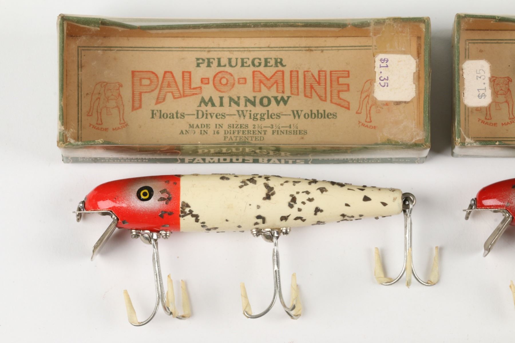 Pflueger, United States. 1950s. Boxed. Palomine, Scoop. Material: Wood. Quantity: 6. Grade: VG. 5" boxes. Est. $100-125.