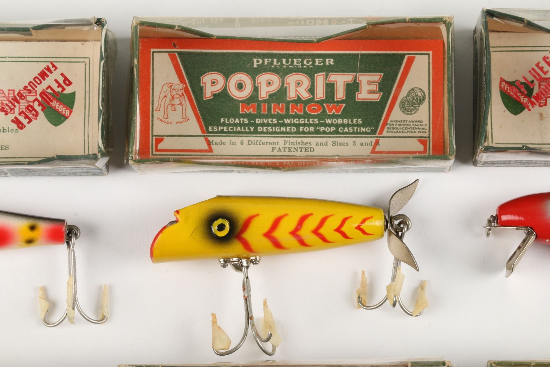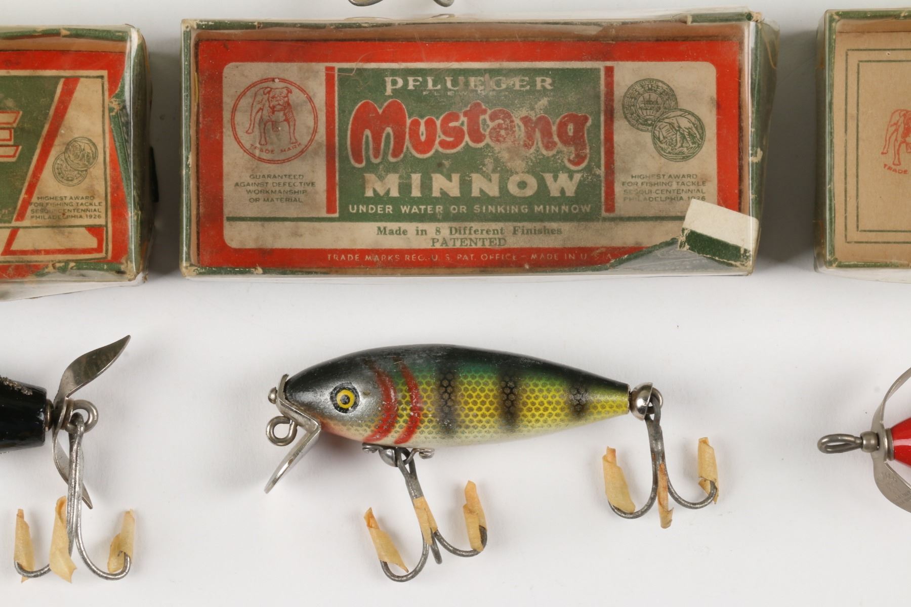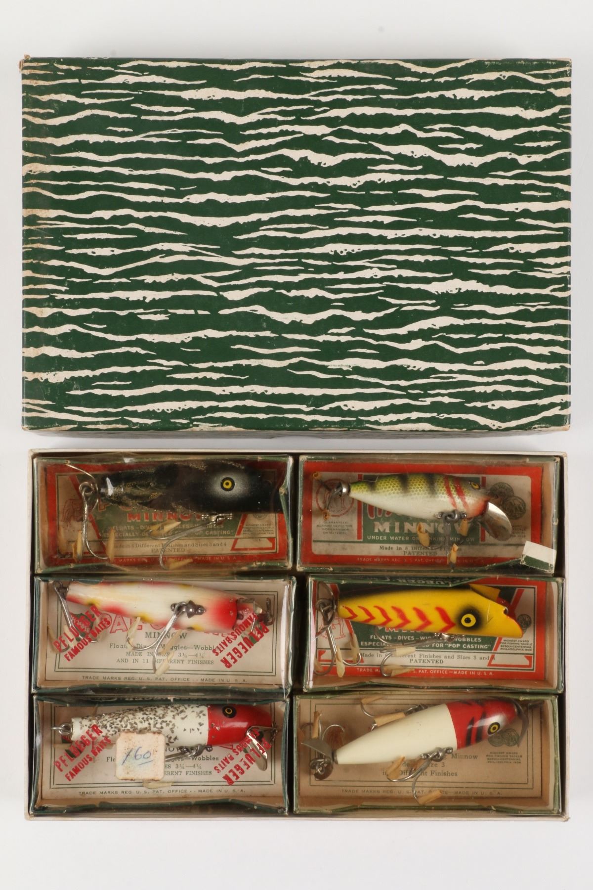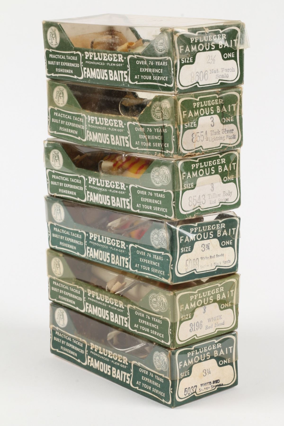 Pflueger, United States. 1950s. Boxed. Perch, Black Silver, Yellow, R/W Spots, R/W, R/W Silver Specks. Material: Wood. Quantity: 6. Grade: VG. 4" boxes. Est. $100-125.