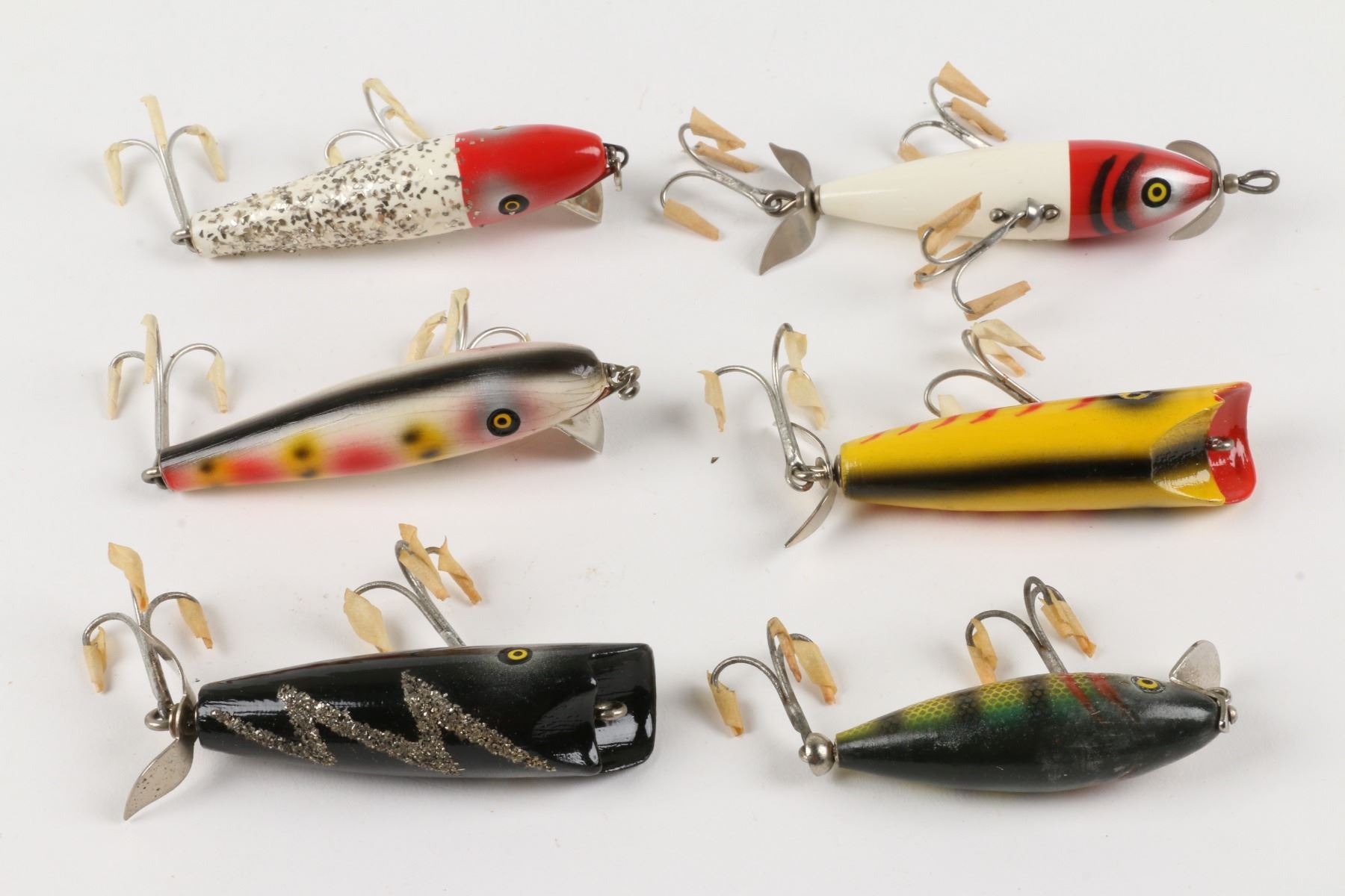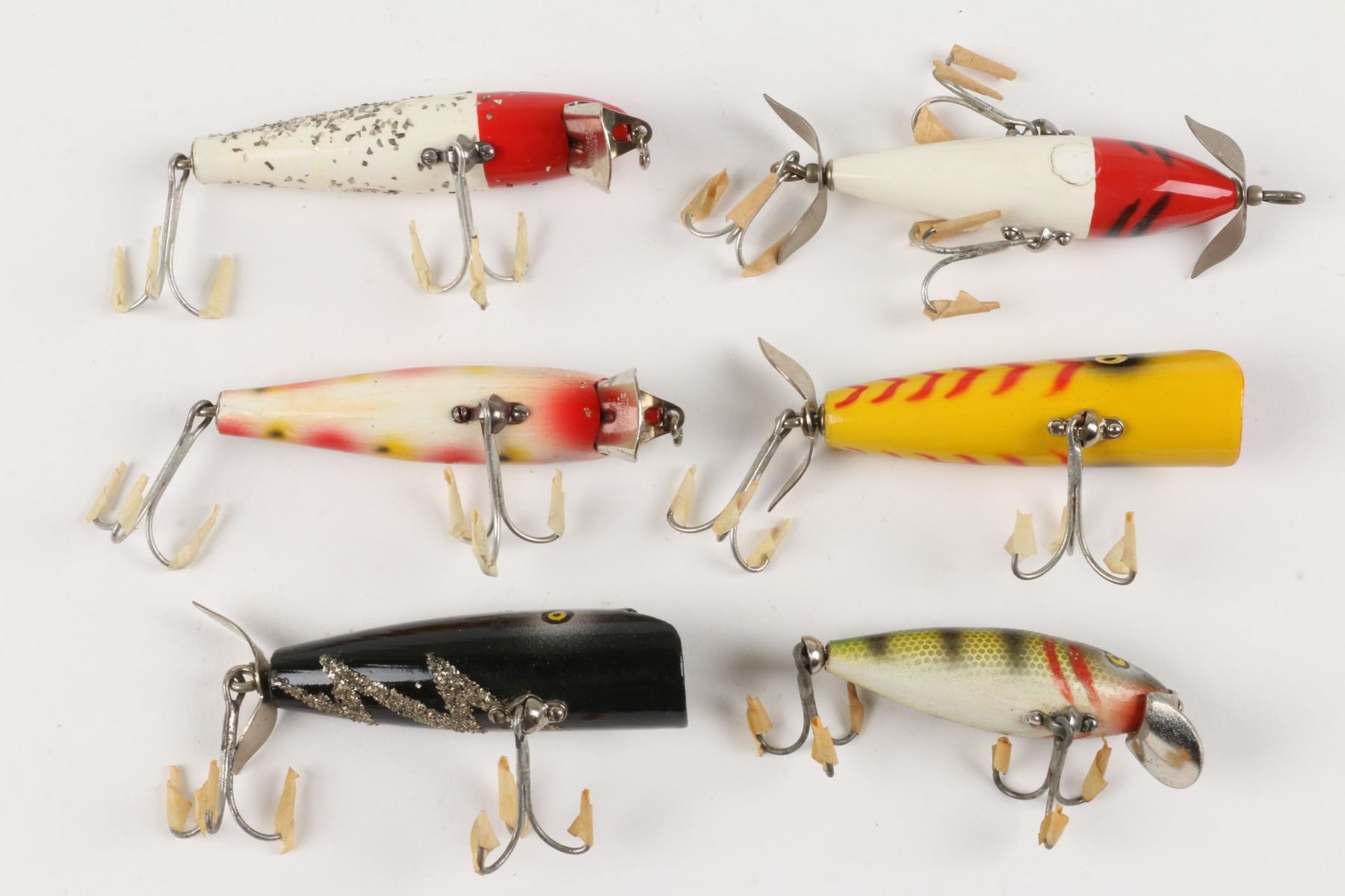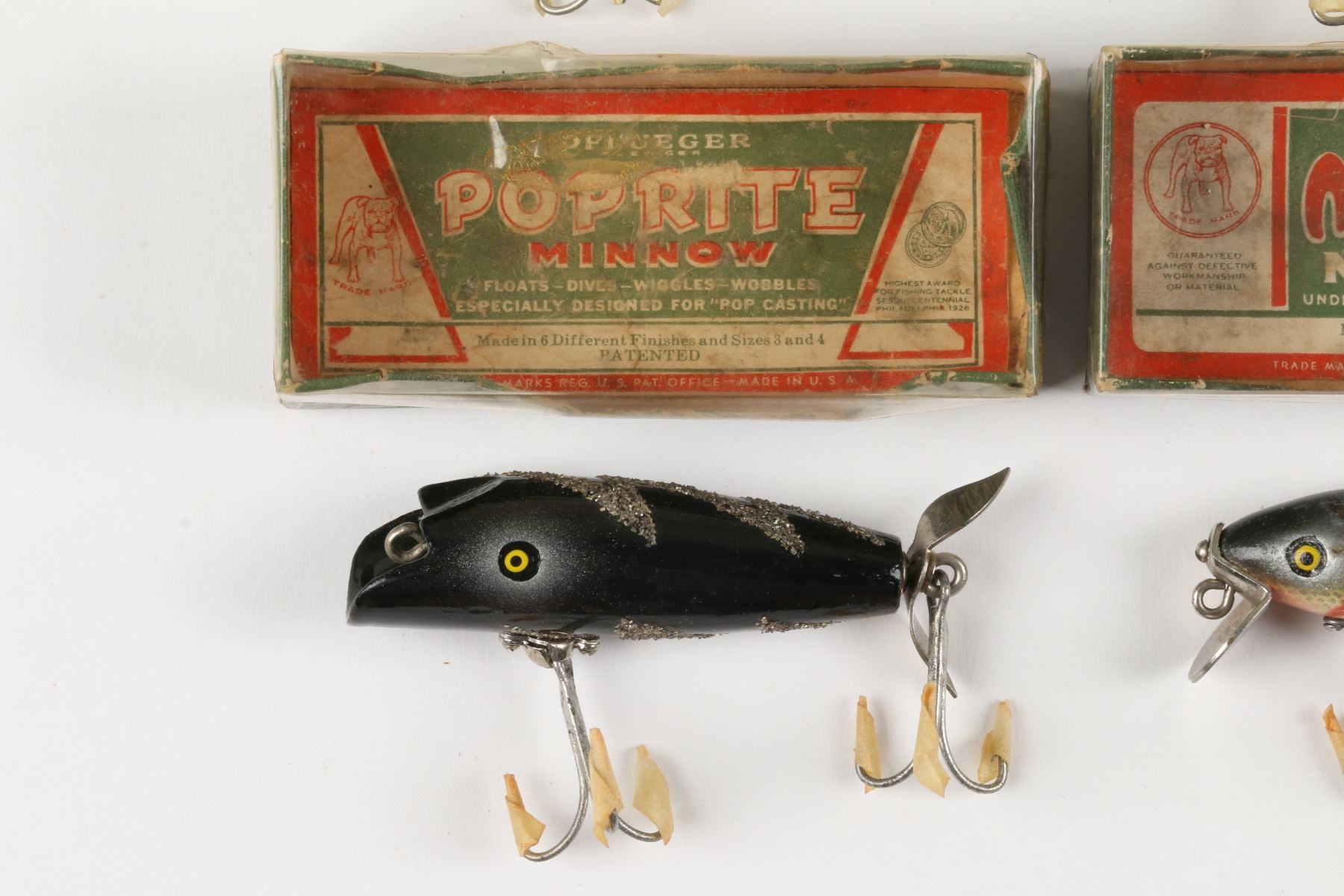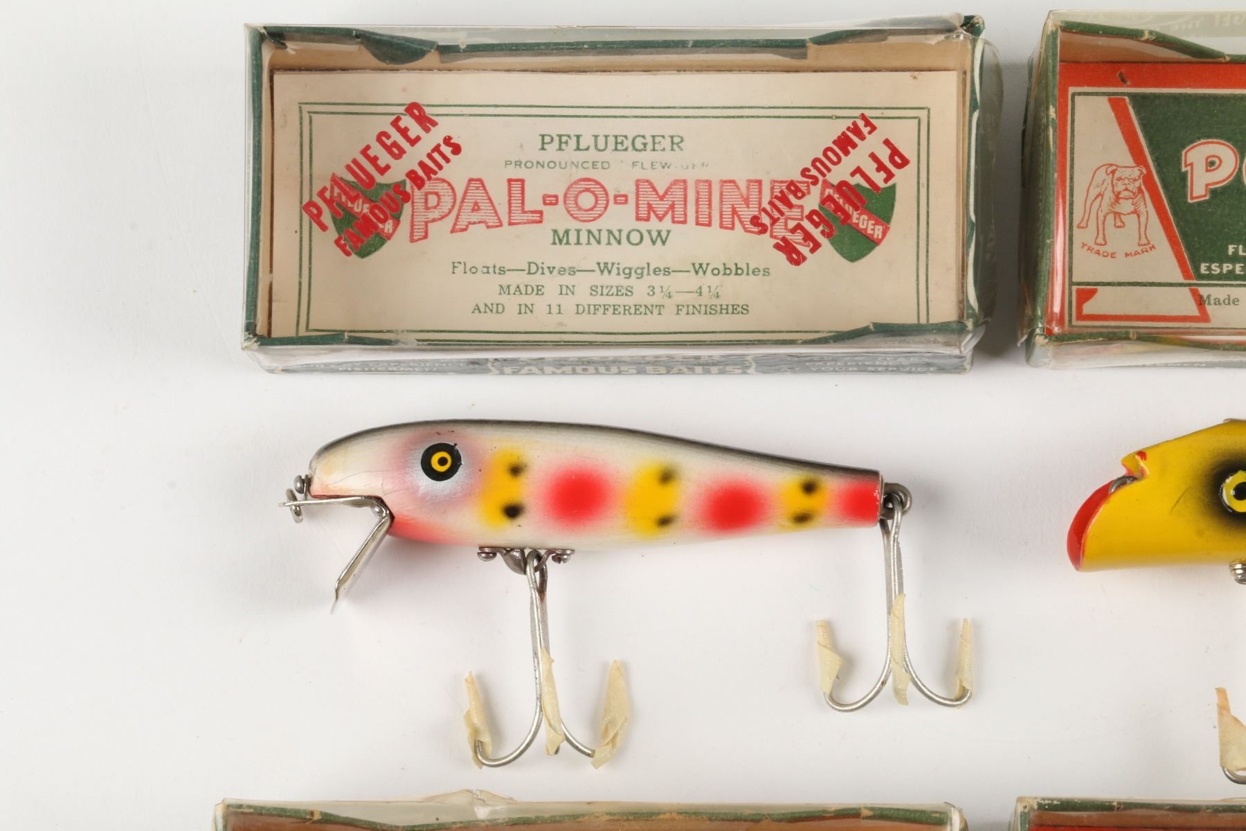 Pflueger, United States. 1950s. Boxed. Perch, Black Silver, Yellow, R/W Spots, R/W, R/W Silver Specks. Material: Wood. Quantity: 6. Grade: VG. 4" boxes. Est. $100-125.