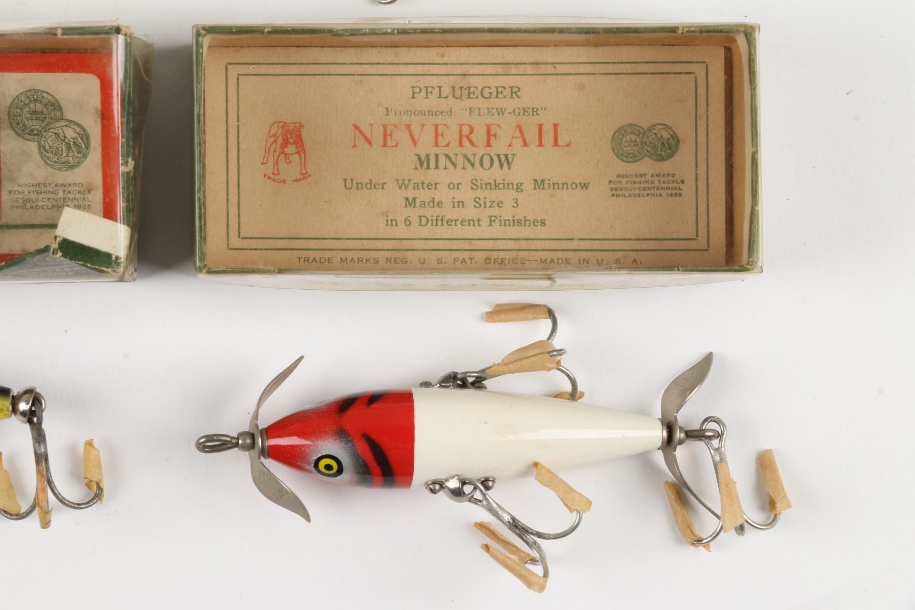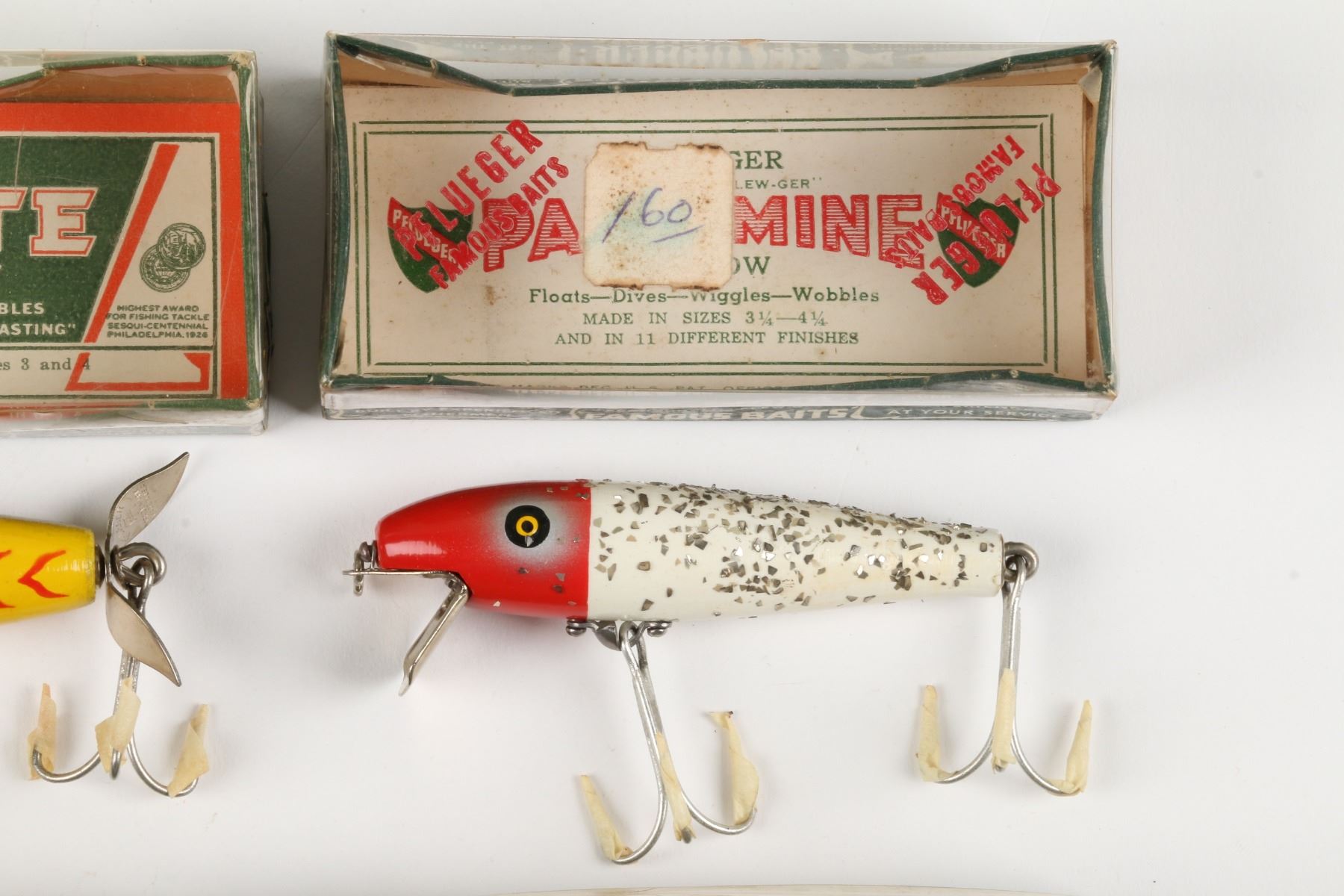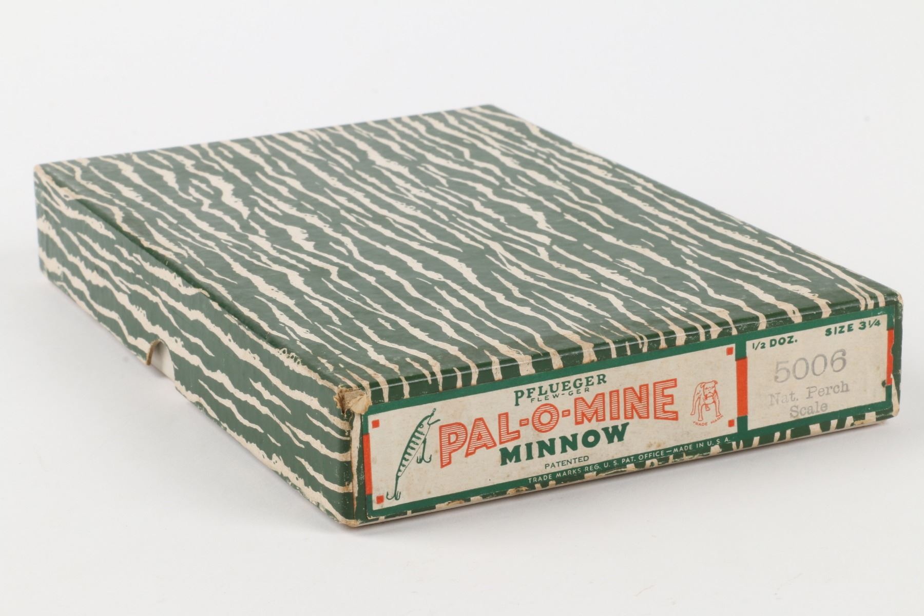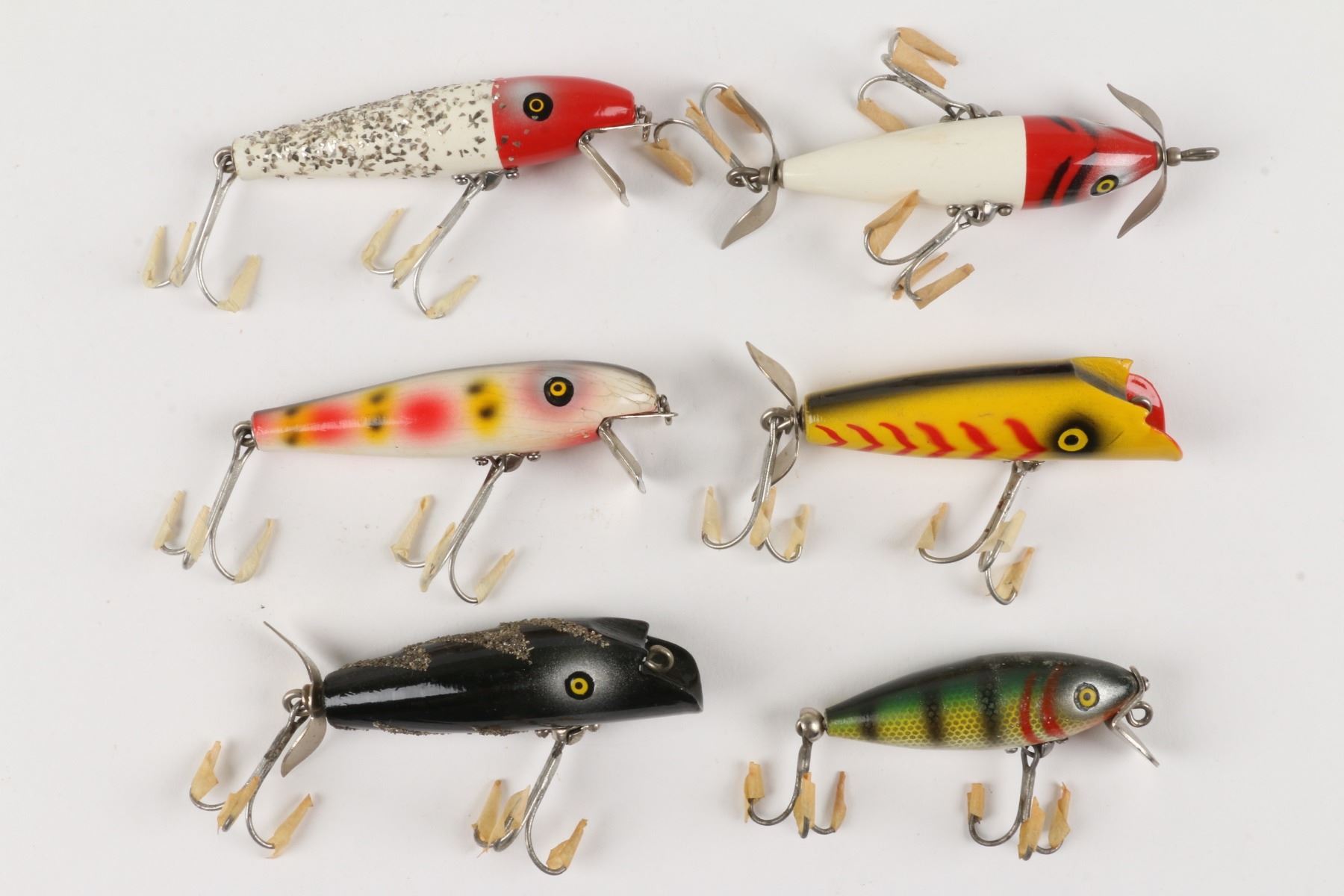 Pflueger, United States. 1950s. Boxed. Perch, Black Silver, Yellow, R/W Spots, R/W, R/W Silver Specks. Material: Wood. Quantity: 6. Grade: VG. 4" boxes. Est. $100-125.
