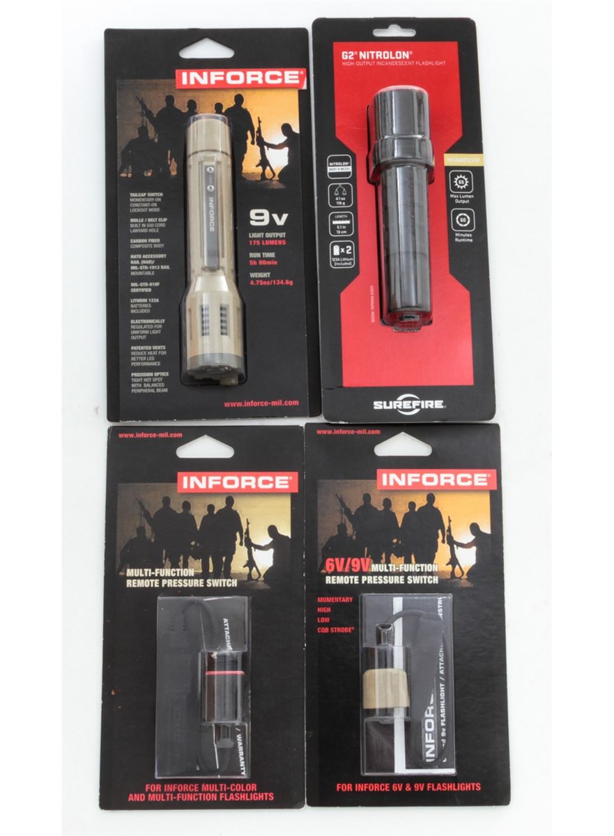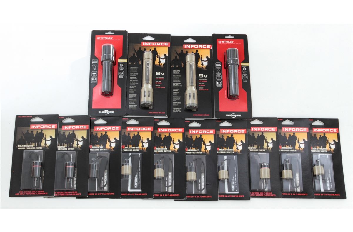 Dealer's Lot of Flashlights and Accessories, including two (2) Inforce 9V flashlights; two (2) Surefire G2 Nitrolon flashlights; seven (7) Inforce 6V/9V Remote Pressure Switches; and three (3) Inforce Multi-Function Remote Pressure Switches. All brand new in their original packaging, fourteen (14) pieces, retailing @ over $550/lot. Est.: $300-$400/lot. (Field Time)