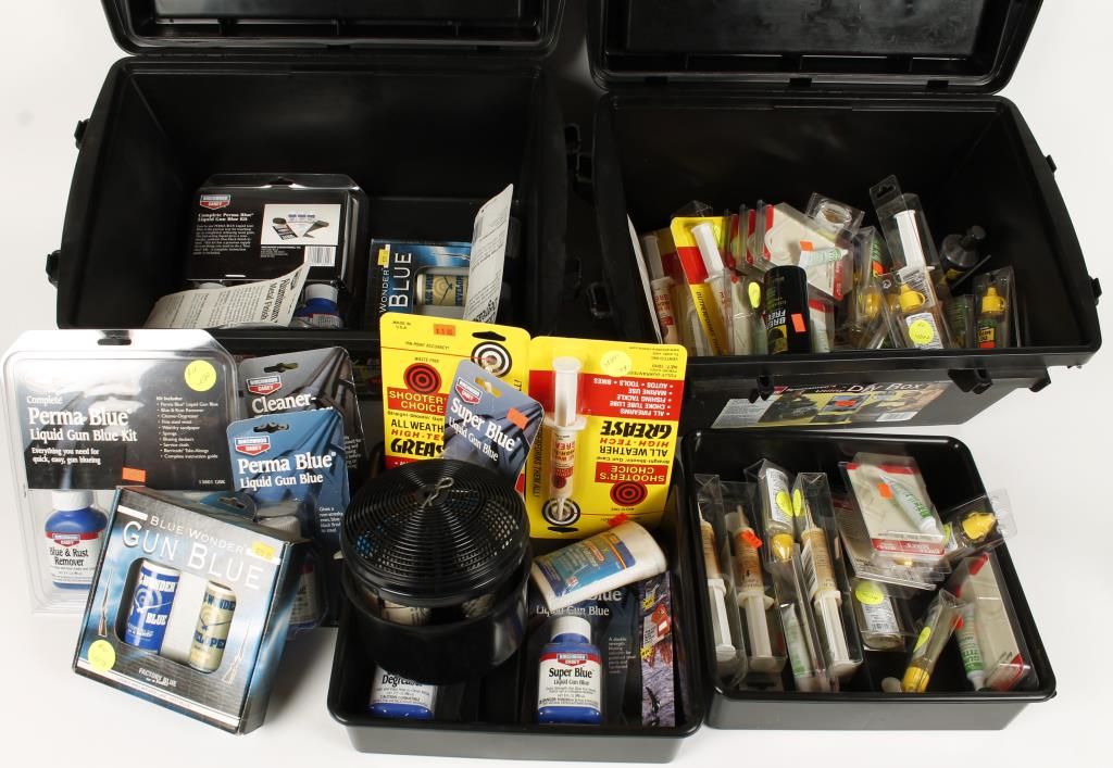 Gun OIl, Gun Lube, Perma Blue, Cleaner/Degreaser, and various other liquid blue and black in sportsmen's utility dry boxes,