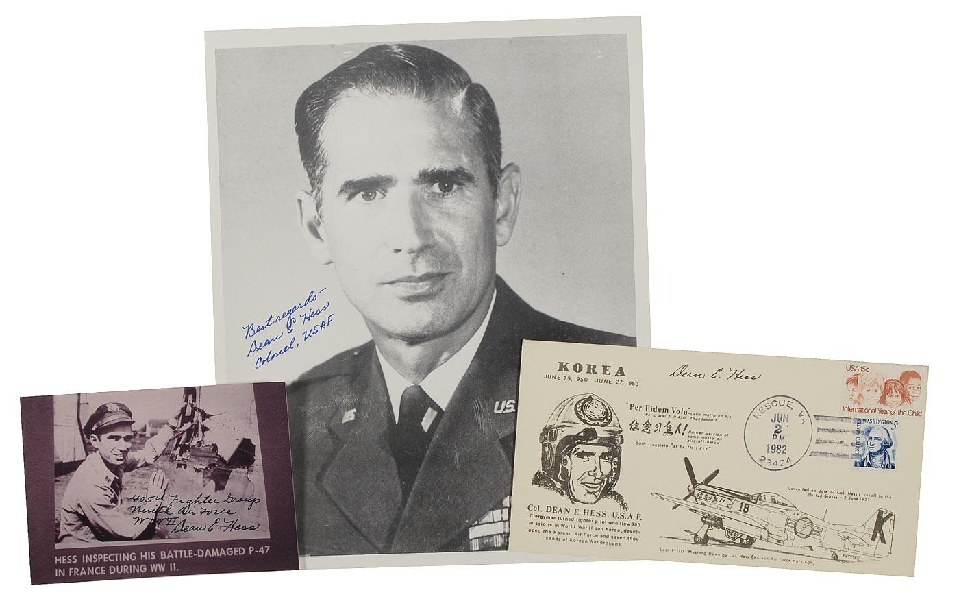 Minister-turned-pilot who flew 300 missions in World War II and Korea, helped train the Korean Air Force, and started an orphanage that helped save the lives of thousands of Korean orphans. Three items: 8 x 10 cardstock image of Hess in dress uniform signed in blue felt tip, “Best regards, Dean E. Hess, Colonel, USAF”; 5 x 3.5 glossy snapshot of an image of Hess inspecting his damaged P-47 signed in black felt tip, “405th Fighter Group, Ninth Air Force, WWII, Dean E. Hess”; and a commemorative cover postmarked June 2, 1982, honoring his service in Korea, signed in black felt tip. In overall fine condition.