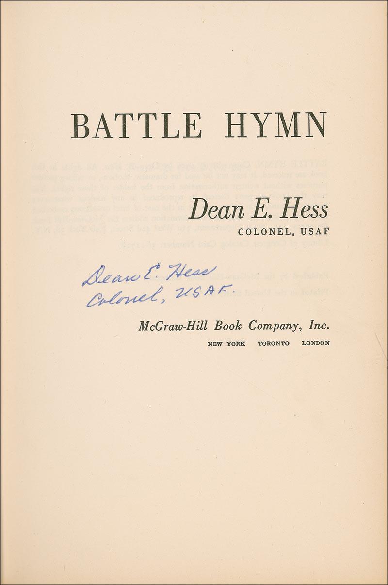 Minister-turned-pilot who flew 300 missions in World War II and Korea, helped train the Korean Air Force, and started an orphanage that helped save the lives of thousands of Korean orphans. Signed book: Battle Hymn. First edition. NY: McGraw-Hill, 1956. Hardcover with dustjacket, 5.75 x 8.25, 246 pages. Signed on the title page in blue ballpoint, “Dean E. Hess, Colonel, USAF.” In fine condition, with scattered toning, creasing, and wear to clipped dustjacket.