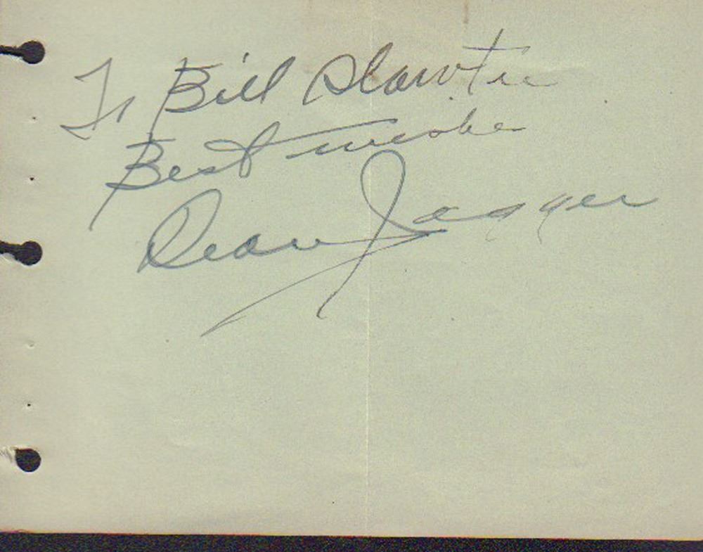 Autograph book page signed by Dean Jagger. It was inscribed to Bill Slawter. The page had been folded in half at some point. All items come with a certificate of authenticity good for the life of the piece.