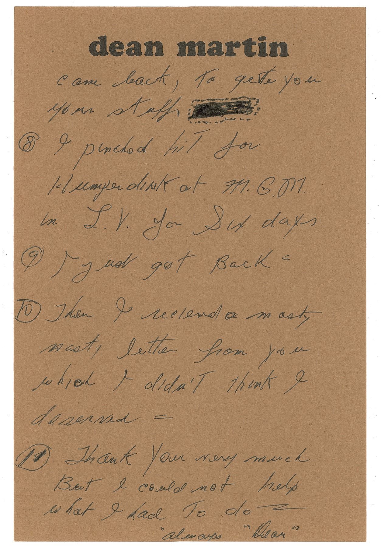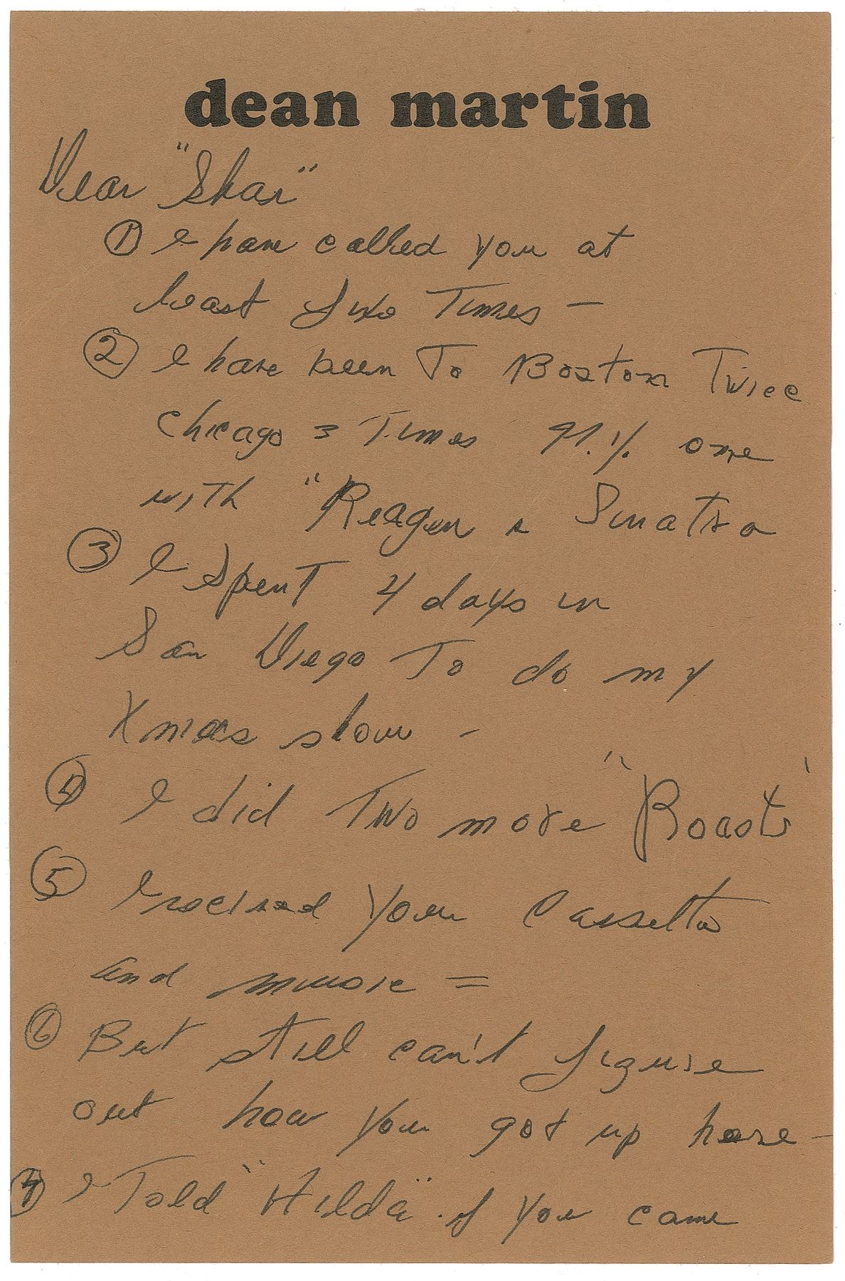 ALS signed “Dean,” two pages, 6.25 x 9.5, personal letterhead, no date. Letter to a girlfriend, 'Shar,' explaining his busy schedule. In full: "1. I have called you at least six times—2. I have been to Boston twice, Chicago 3 times, N.Y. once with Reagan & Sinatra, 3. I spent 4 days in San Diego to do my Xmas show, 4. I did two more 'Roasts,' 5. I released your cassette and music, 6. But still can't figure out how you got up here, 7. Told 'Hilda' if you came back, to get you your stuff, 8. I pinched hit for Humperdinck at M.G.M. in L.V. for six days, 9. I got back, 10. Then I received a nasty nasty letter from you which I didn't think I deserved, 11. Thank you very much but I could not help what I had to do." In fine condition.