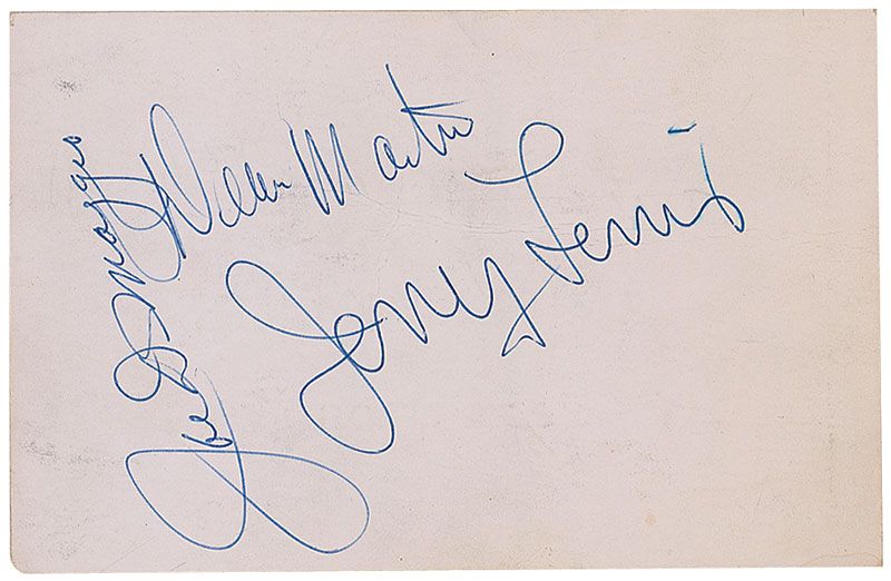 Ballpoint signatures, “Dean Martin,” “Jerry Lewis,” and “Joe DiMaggio,” on the reverse of an off-white 5.5 x 3.5 drink card from Club 500 in Atlantic City. A light horizontal crease, otherwise fine condition.