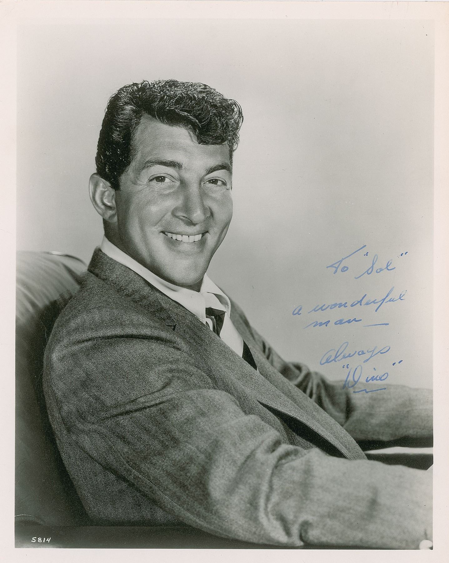 Vintage matte-finish 8 x 10 photo of Martin smiling, signed and inscribed in fountain pen to producer Sol Siegel, "To 'Sol,' a wonderful man—always, 'Dino.'” A typed caption on the reverse reads: "Dean Martin, now starring in 'Some Came Running,' a Sol C. Siegel Production for MGM release." In very fine condition.