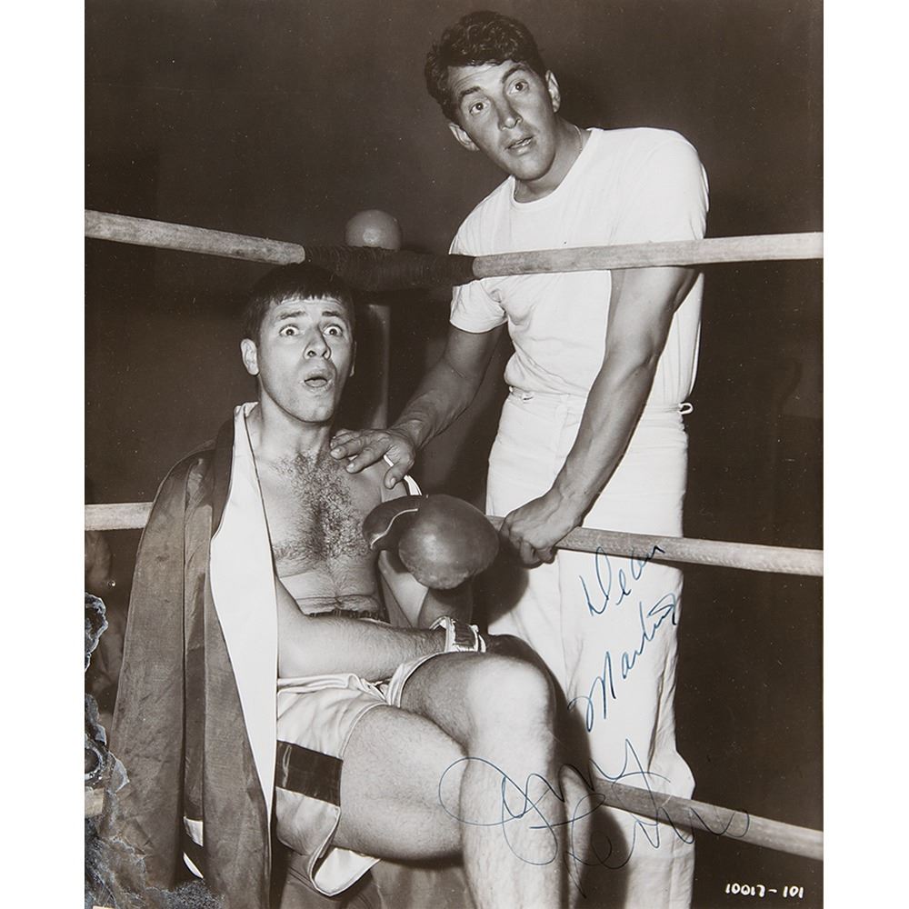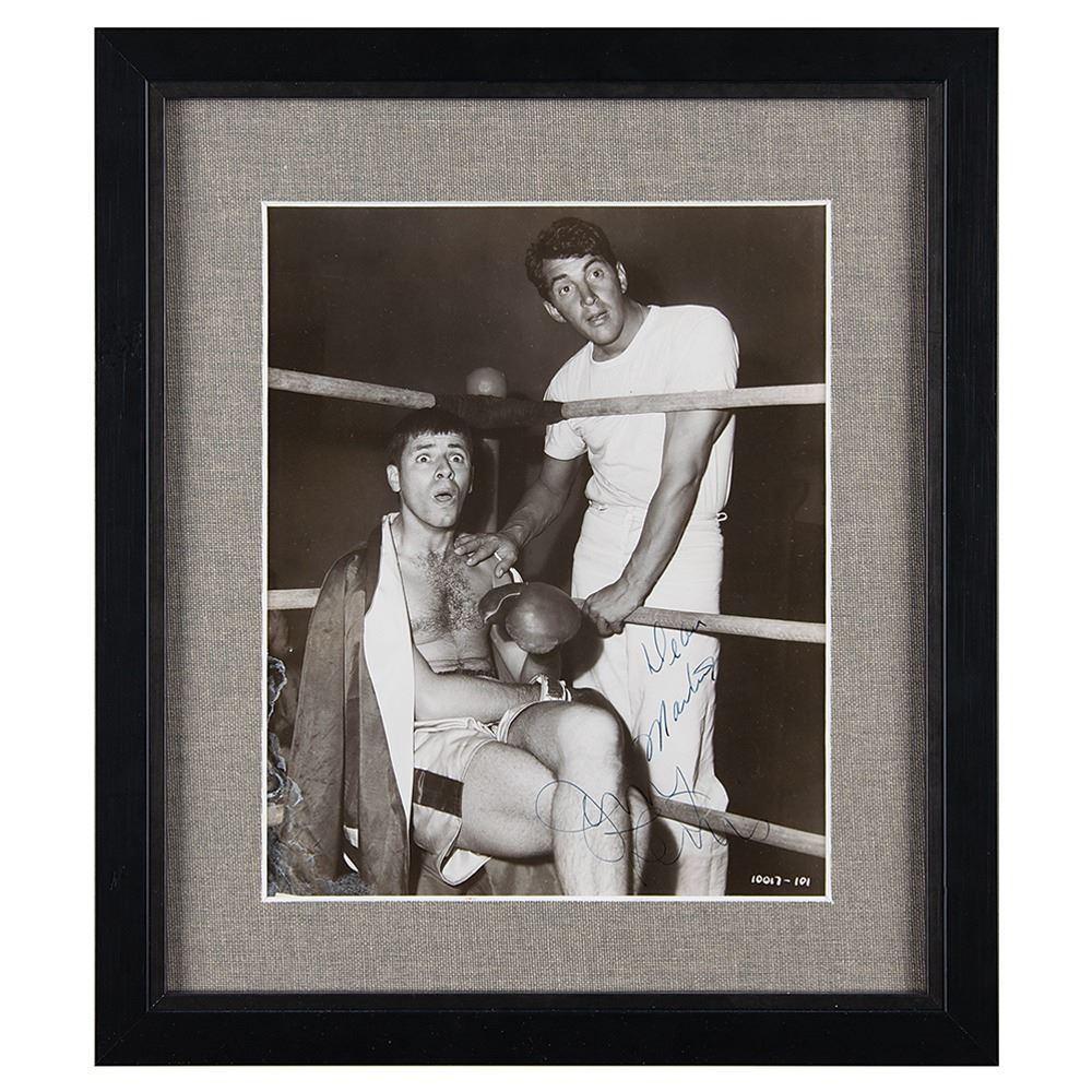 Vintage glossy 7.5 x 9.25 photo of the great comedy duo in a boxing ring in the 1952 film Sailor Beware, signed in fountain pen by Dean Martin and Jerry Lewis. Archivally matted and framed to an overall size of 12 x 13.5. In very good to fine condition, with a crease slightly touching Martin's face, and some light surface damage to the lower left corner.