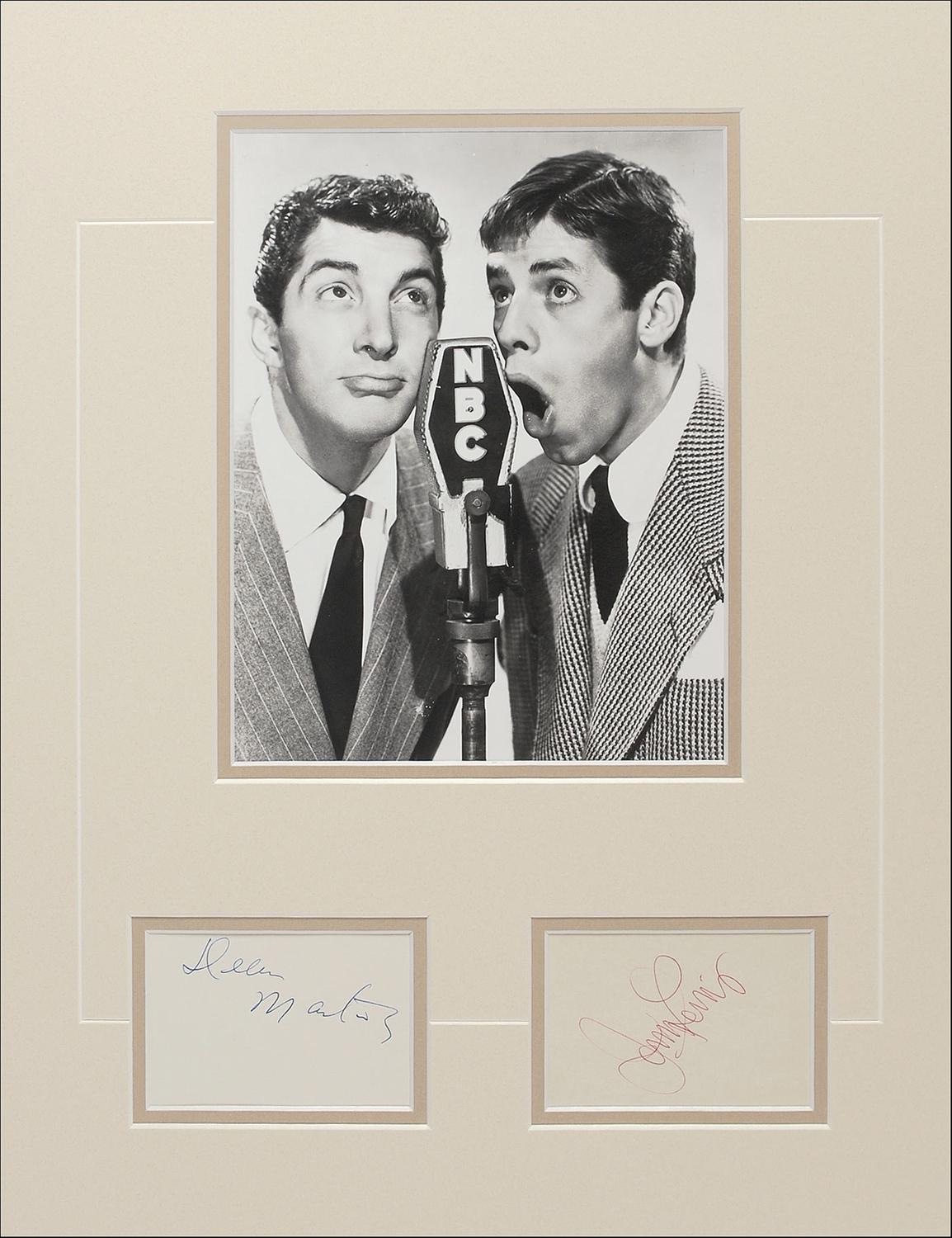 Ballpoint signatures, “Dean Martin,” and “Jerry Lewis,” on individual off-white cards. Both are double matted together with a glossy photo of the two sharing an NBC microphone to an overall size of 14 x 18. In fine condition.
