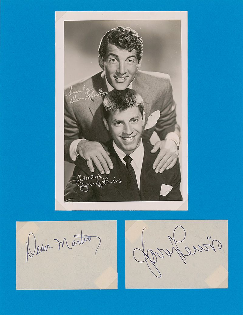 Vintage fountain pen signatures on individual 3.5 x 2.5 off-white slips, “Dean Martin” and “Jerry Lewis.” In fine condition, with a trivial brush to Martin’s signature, and some show-through from signatures on the reverse. Accompanied by an unsigned promotional photo of the comedy team.
