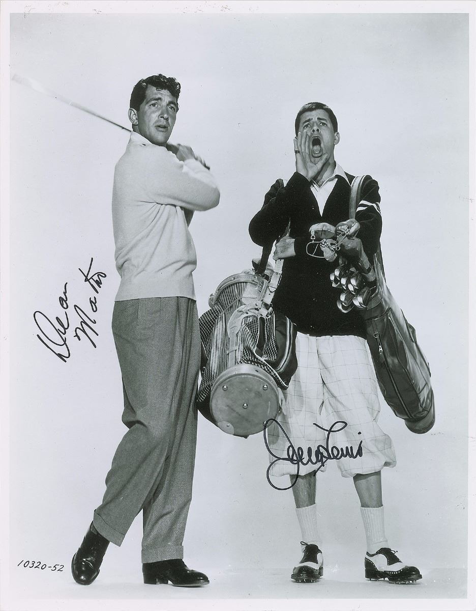 Humorous satin-finish 11 x 14 full-length photo of Martin and Lewis from the 1953 film The Caddy, signed by both in black felt tip. In fine condition.