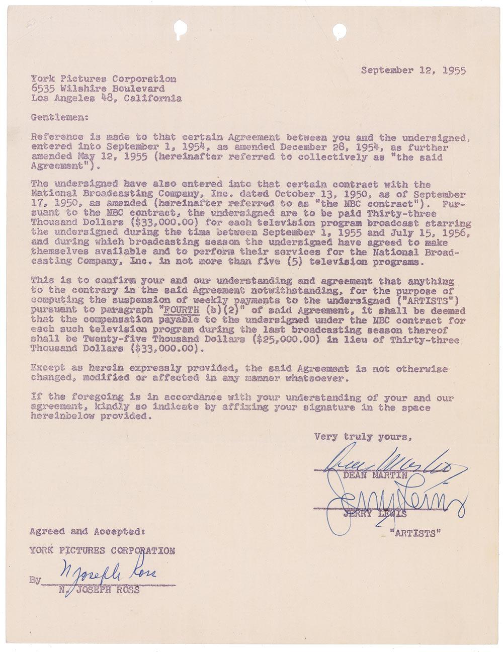 DS, one page, 8.5 x 11, September 12, 1955. Agreement between Martin and Lewis and York Pictures Corporation, with Martin and Lewis agreeing to taking a pay cut from $33,000 to $25,000 during the last broadcasting season on NBC. Signed at the conclusion in blue ballpoint, “Dean Martin,” and “Jerry Lewis.” In fine condition, with punch and staple holes to top edge, and a mild shade of uniform toning.